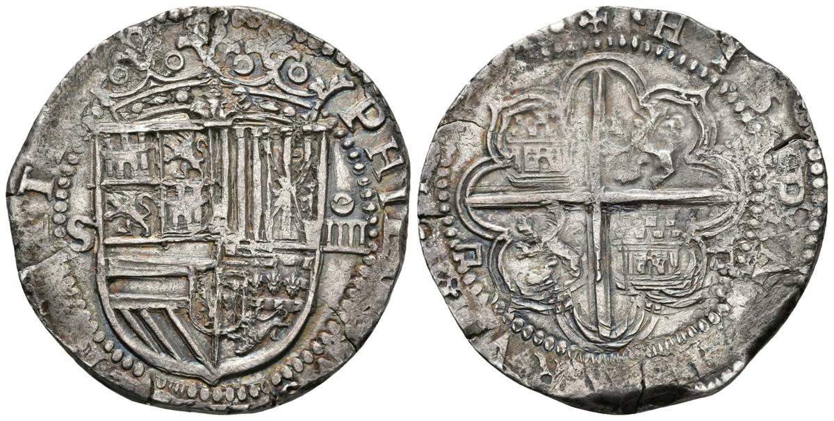 FELIPE II. 4 Reales. S/D. Sevilla. Ensayador en 3º y 4º cuartel. Flor de lis entre escudo y corona. Cal-392var. Ar. 13,21g. Suave pátina. MBC+.