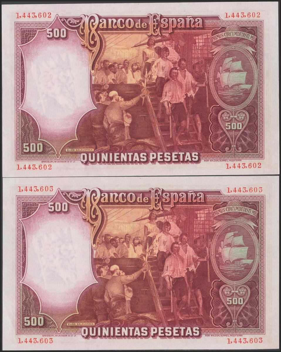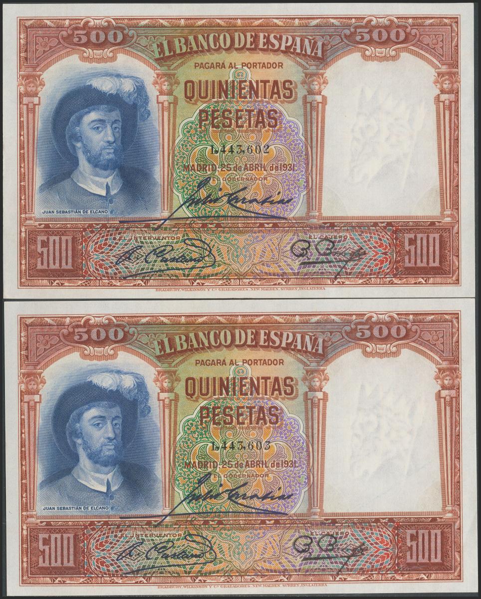 500 pesetas. April 25, 1931. Correlative pair. No serie. (Edifil 2021: 361). Original sizing. Almost Uncirculated.