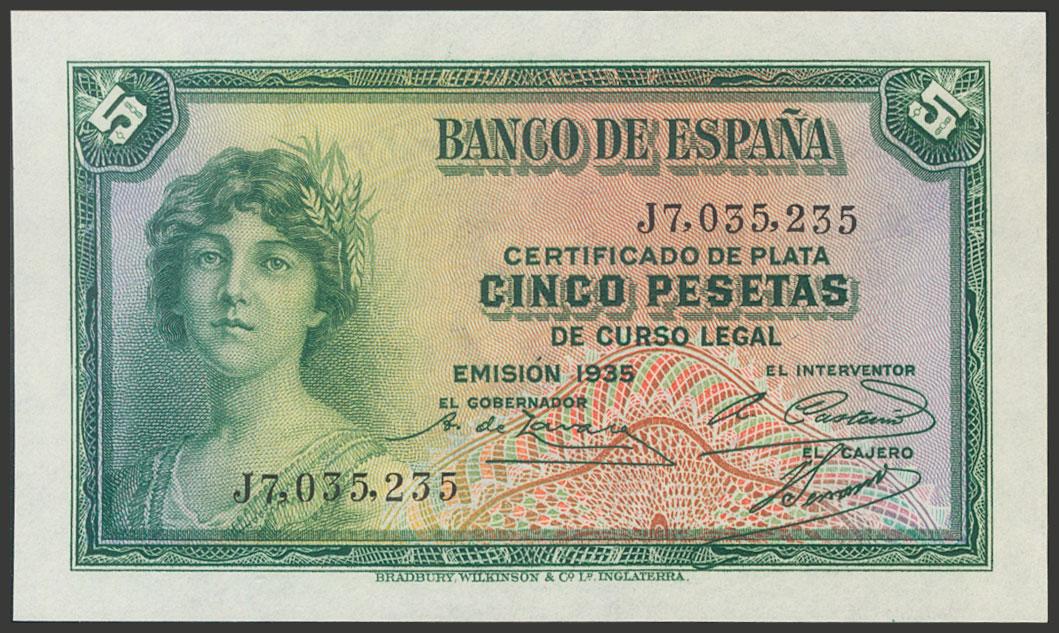 5 Pesetas. 1935. Silver Certificate. Series J. (Edifil 2017: 363b). It keeps all its original size. Uncirculated.