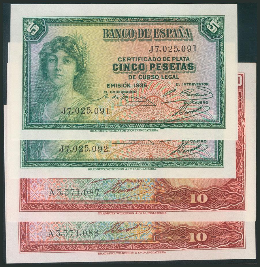 English Set of 2 correlative pairs of 5 Pesetas and 10 Pesetas issued in 1935 and with series J and A, respectively (Edifil 2017: 363b and 364a). Original sizing. Uncirculated.