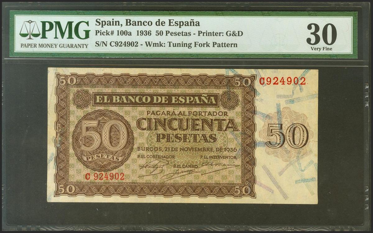 English 50 pesetas. November 21, 1936. Series C. (Edifil 2021: 420a, Pick: 100a). Good Very Fine. Packaged PMG30.