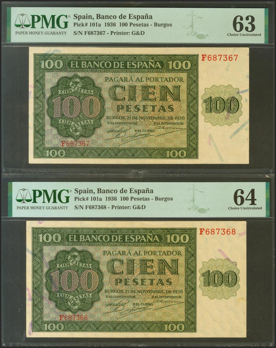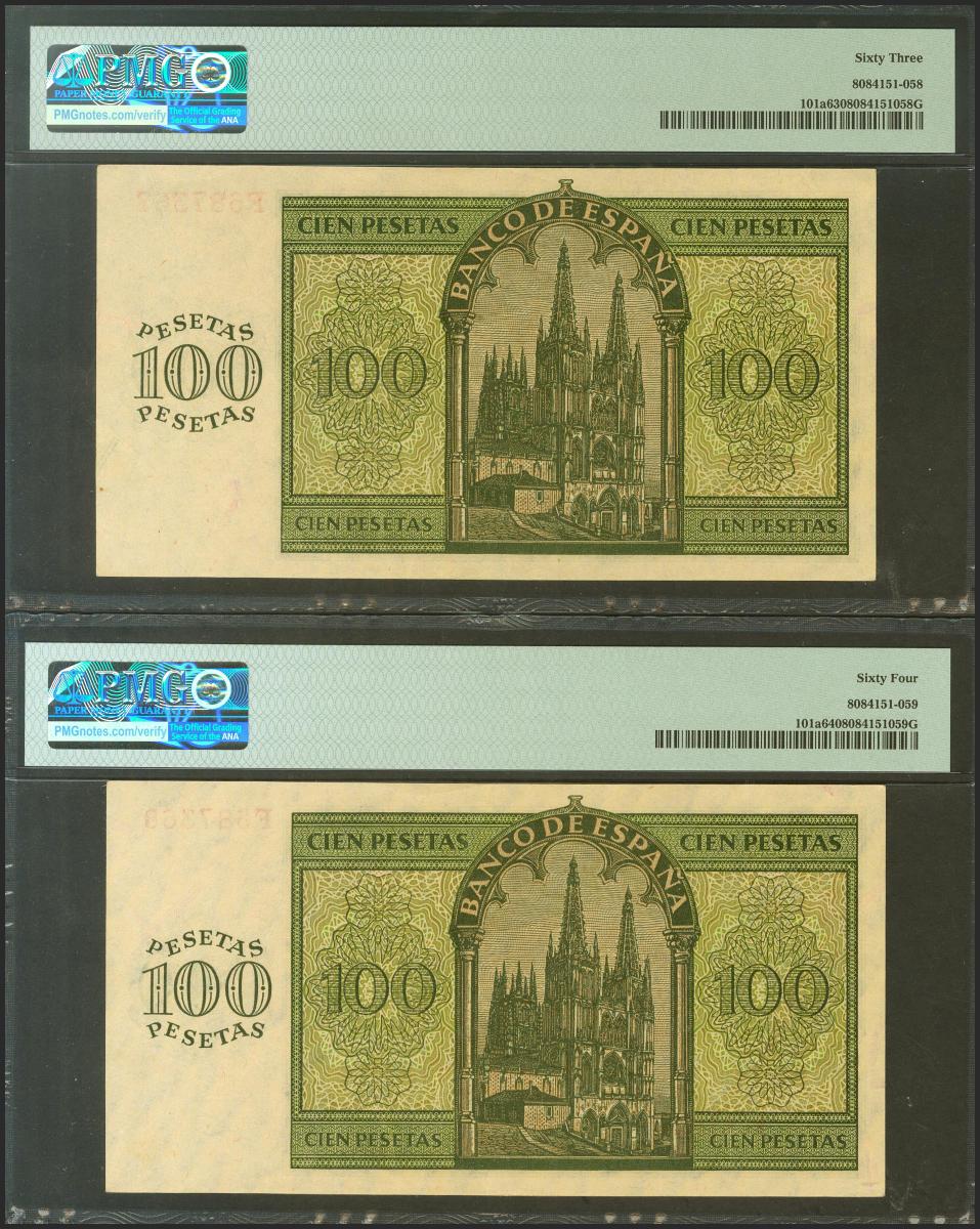 English 100 pesetas. November 21, 1936. Correlative pair. Series F. (Edifil 2021: 421a, Pick: 101a). Uncirculated. Encapsulated PMG64 / 63.