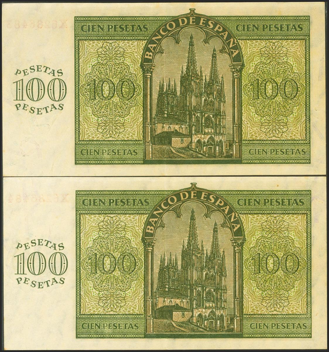 100 pesetas. November 21, 1936. Correlative pair. Series X, last series issued. (Edifil 2017: 421a). Keep some original sizing. Good Extremely Fine.
