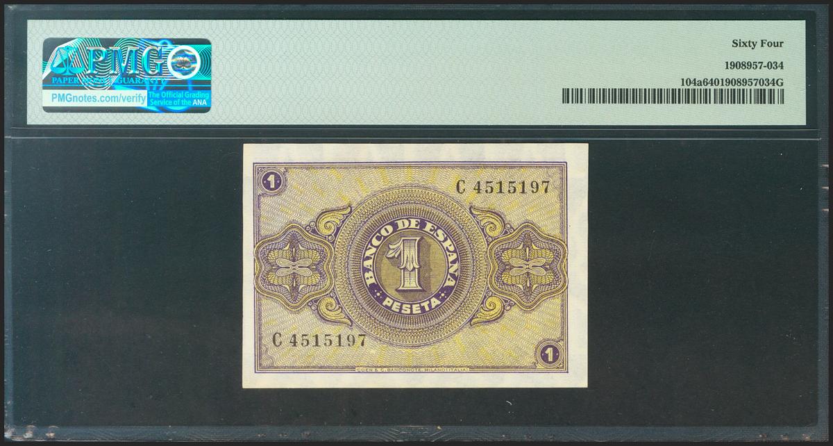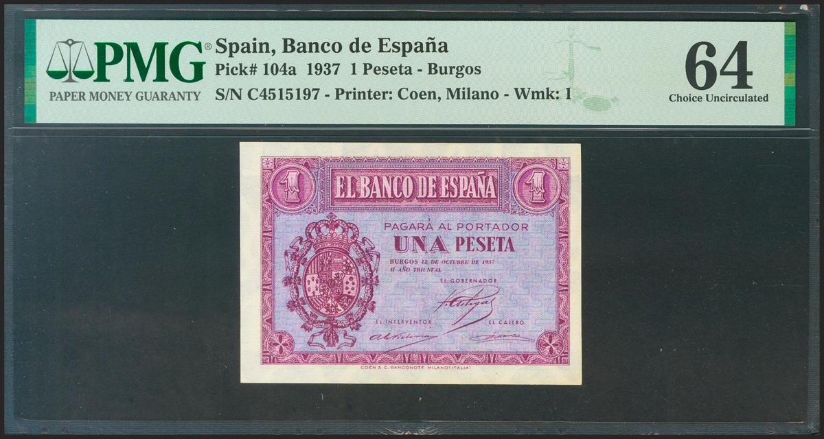 1 Pesetas. October 12, 1937. Series C. (Edifil 2021: 425a, Pick: 104a). Unusual in this quality. Uncirculated. PMG64 package.
