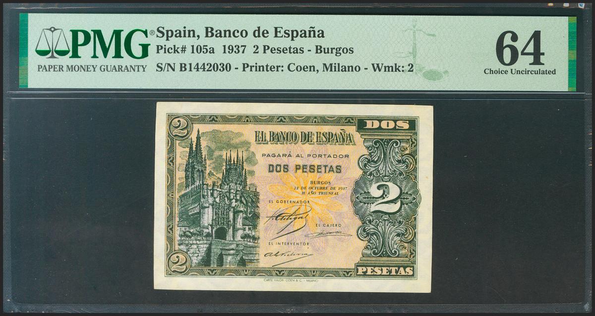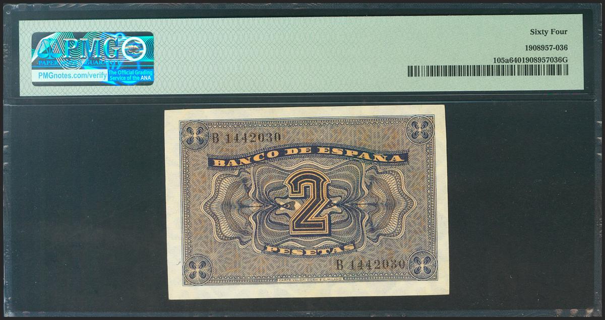 English 2 Pesetas. October 12, 1938. Series B. (Edifil 2021: 426a). Unusual Uncirculated. PMG64 package.