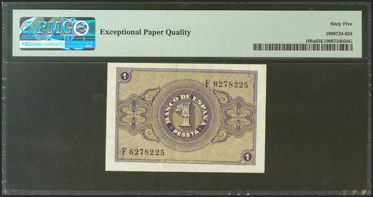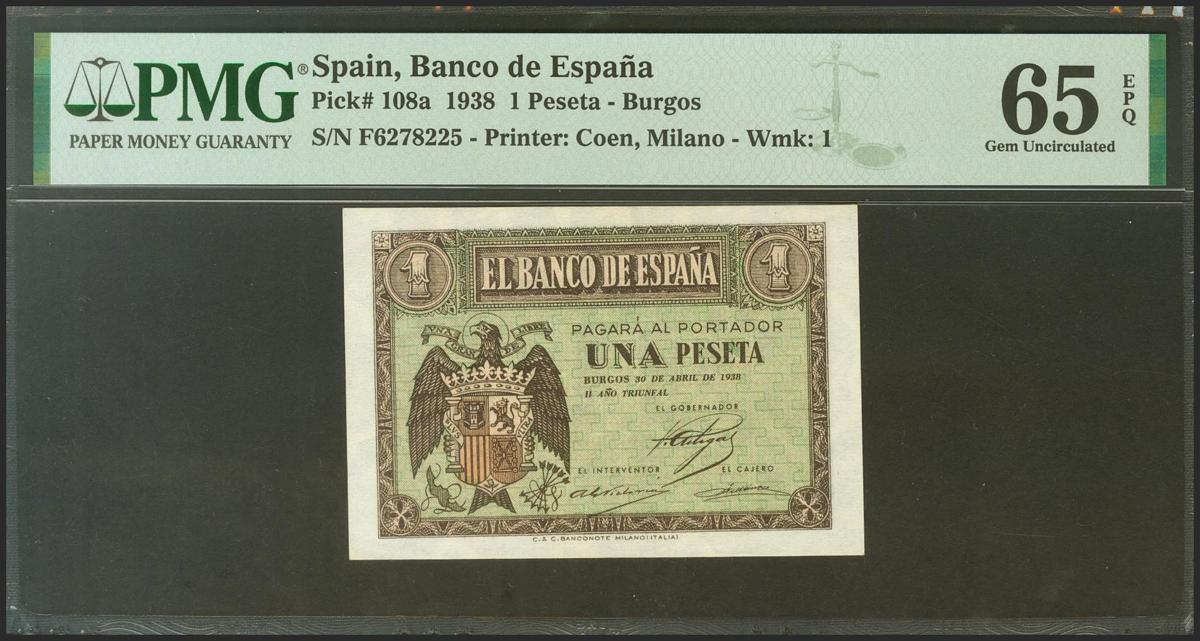1 peseta. April 30, 1938. Series F. (Edifil 2021: 428a, Pick: 108a). Unusual in this exceptional quality, original sizing. Uncirculated. PMG65EPQ package.