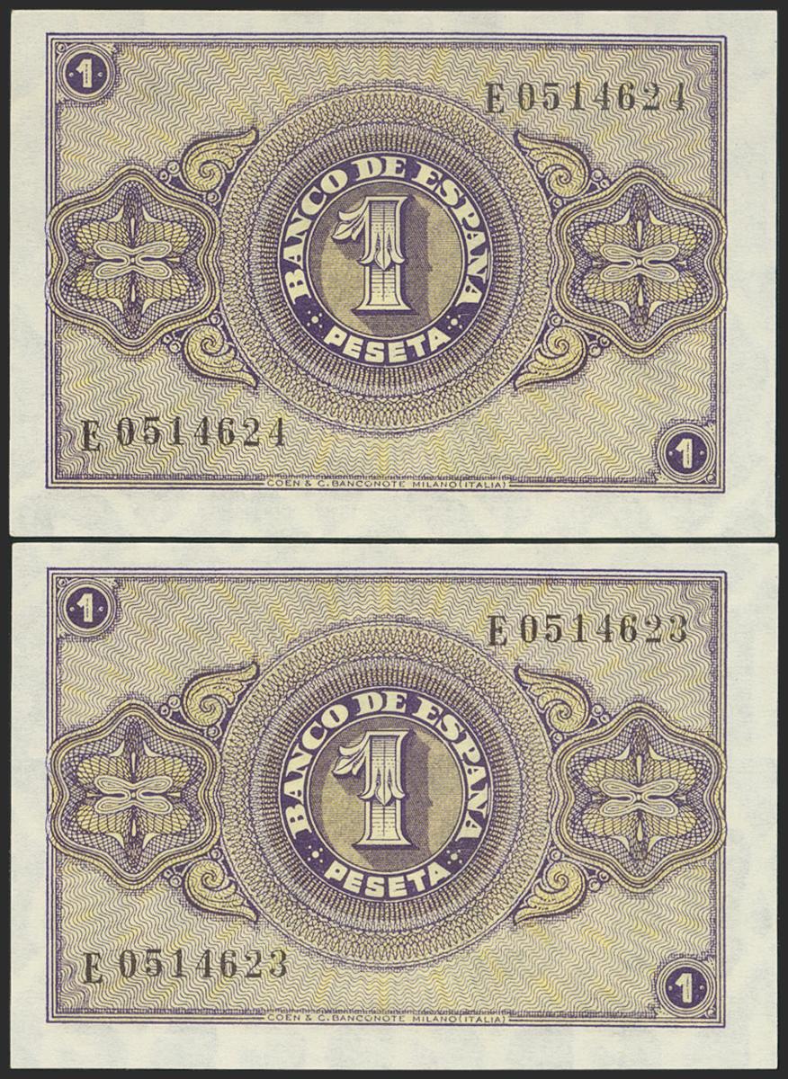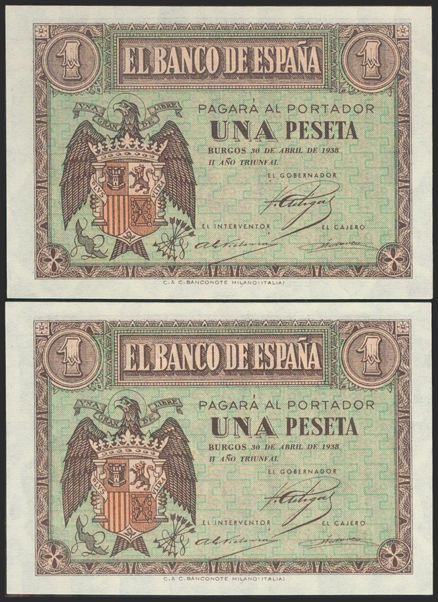 1 peseta. April 30, 1938. Correlative pair. Series E. (Edifil 2021: 428a). Original sizing. Uncirculated.