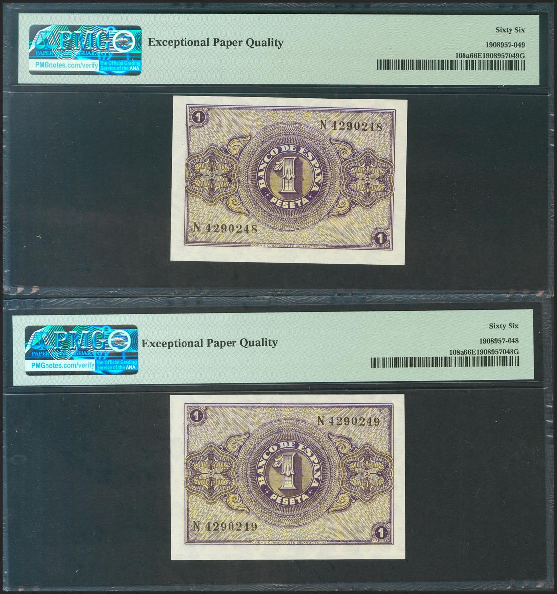 1 Pesetas. April 30, 1938. Correlative pair. Series N, last series issued. (Edifil 2021: 428b, Pick: 108a). Rare in this quality, original sizing. Uncirculated. PMG66EPQ package, both.