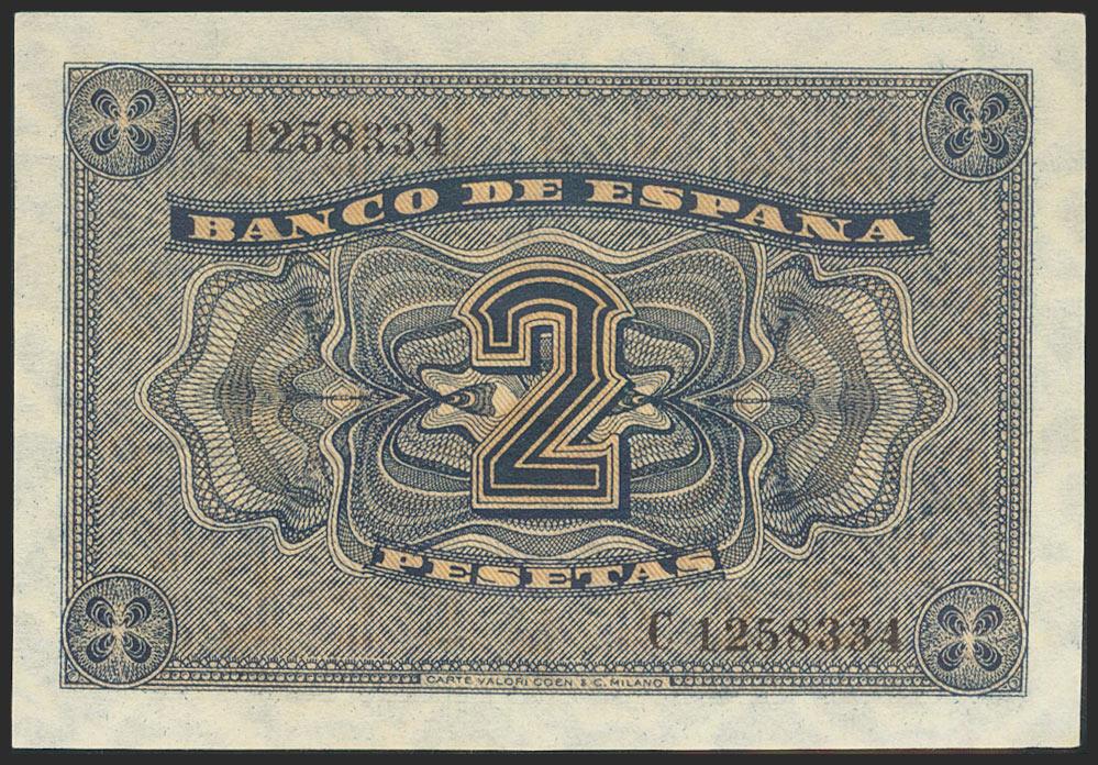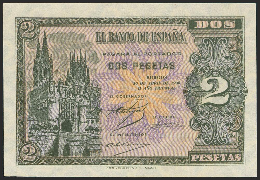 English 2 Pesetas. April 30, 1938. Series C. (Edifil 2021: 429a). Original sizing. Uncirculated.