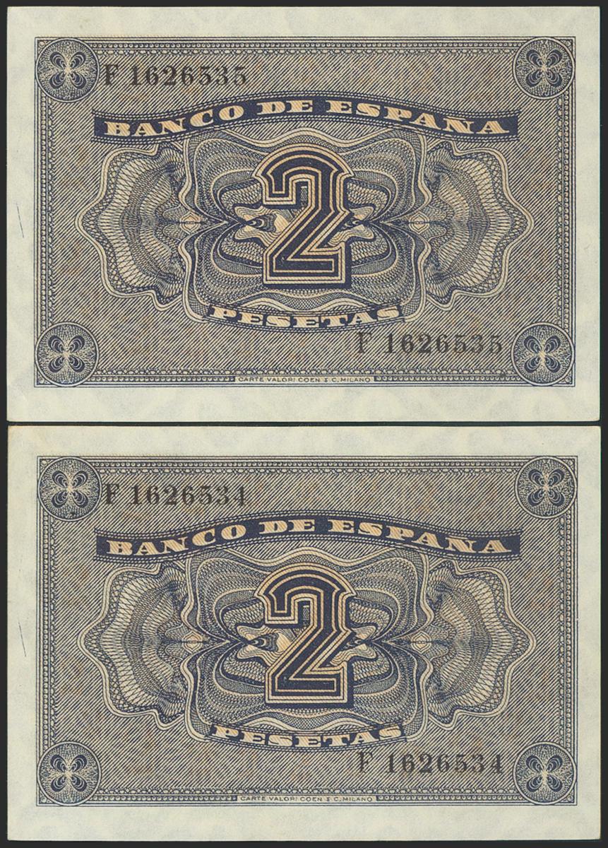 2 Pesetas. April 30, 1936. Correlative pair. Series F. (Edifil 2021: 429a). Original sizing. Uncirculated.