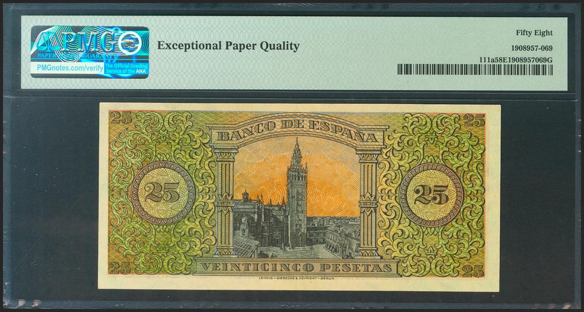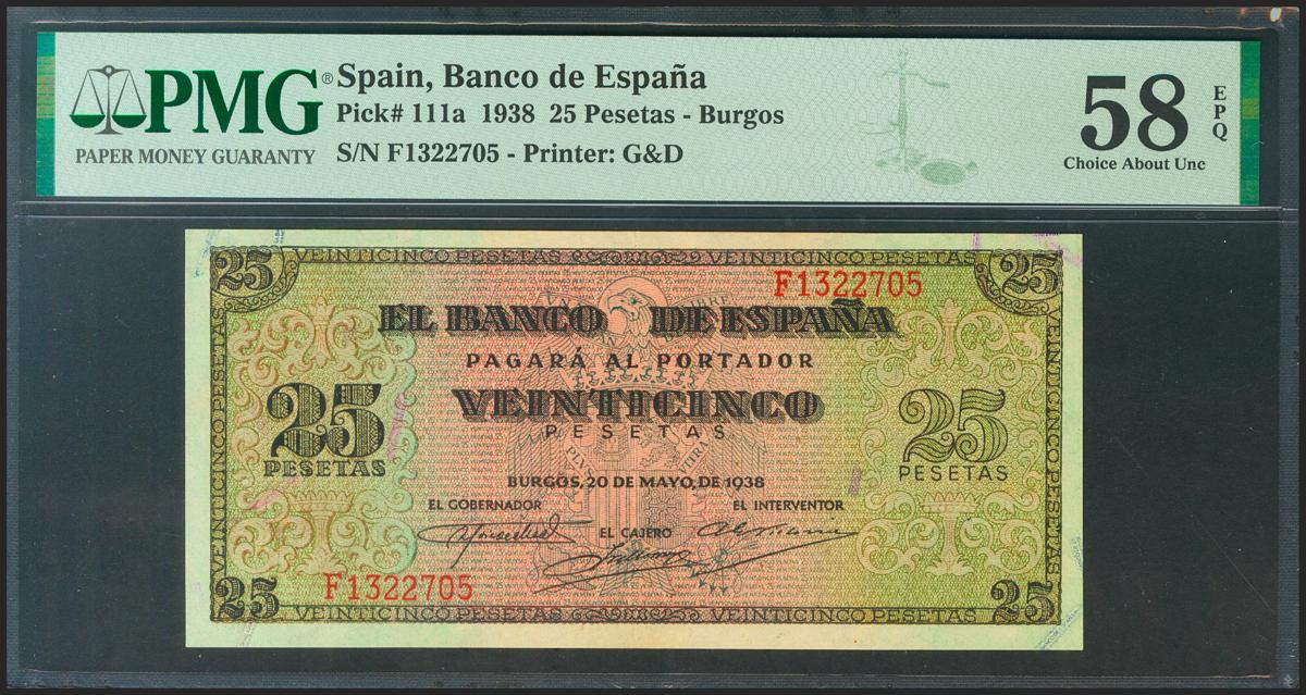 25 pesetas. May 20, 1938. Series F. (Edifil 2021: 430a, Pick: 111a). Original sizing. EBC +++. Package PMG58EPQ.