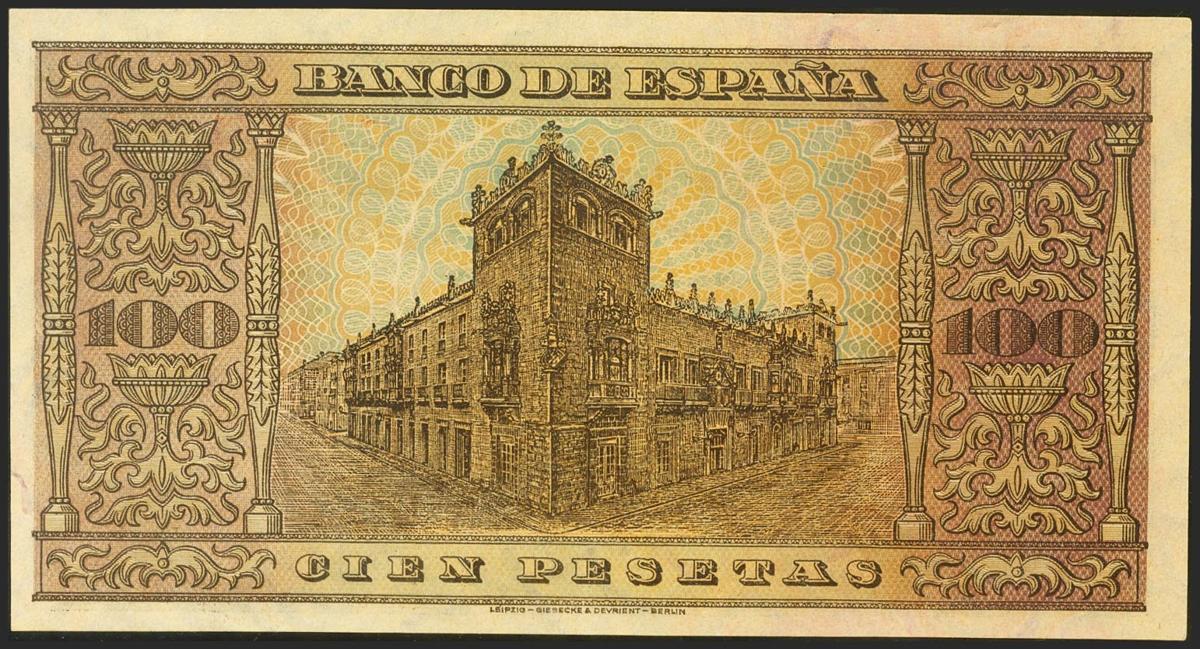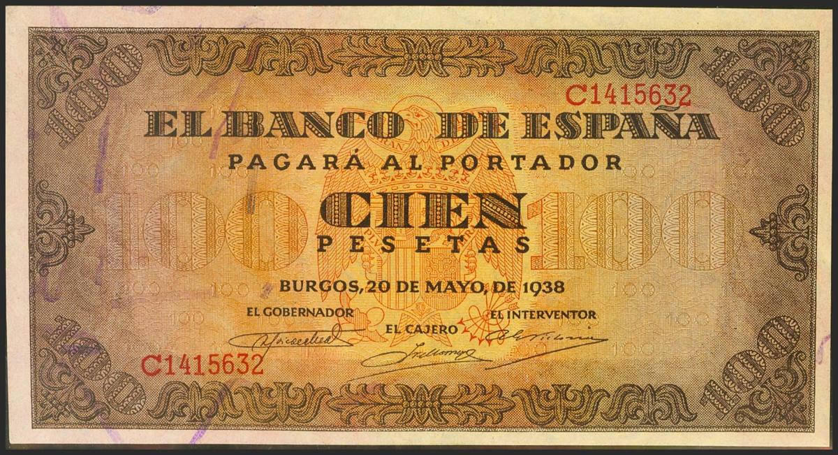 English 100 pesetas. May 20, 1938. Series C. (Edifil 2021: 432a). It preserves all the original sizing, a very attractive bill of enormous quality. Uncirculated.