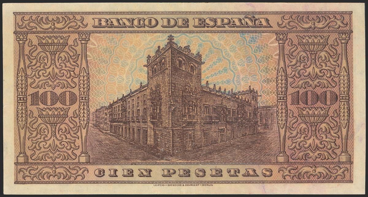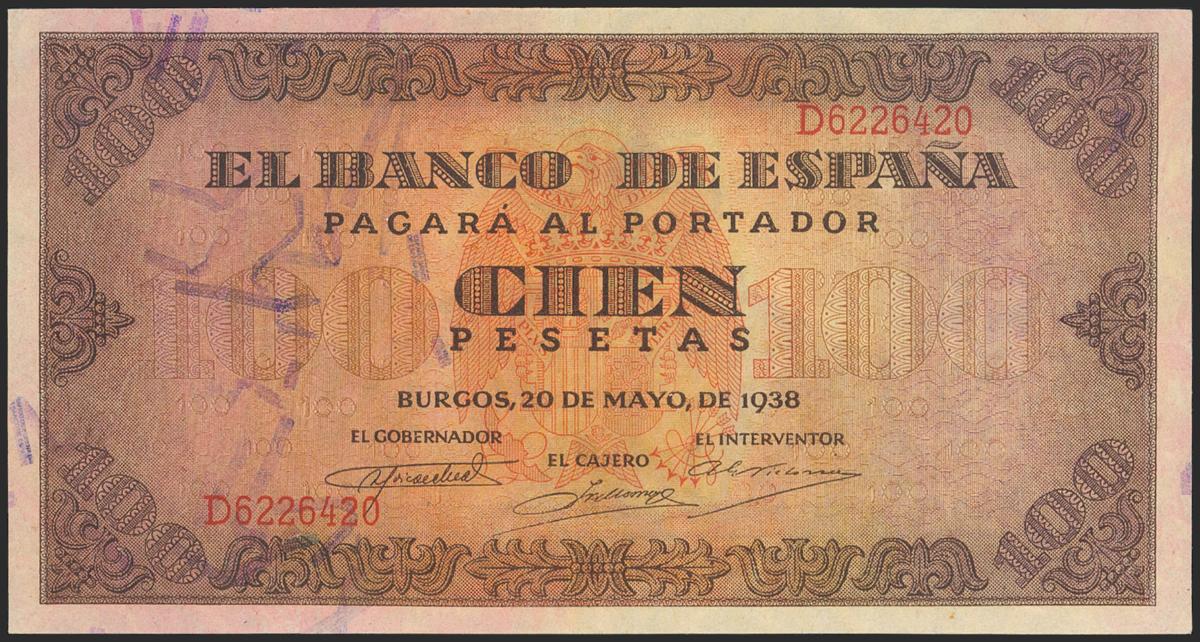 100 pesetas. May 20, 1938. Series D. (Edifil 2021: 432a). It retains much of the original size. Good Extremely Fine.