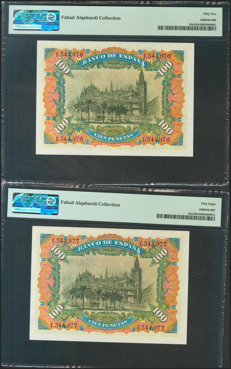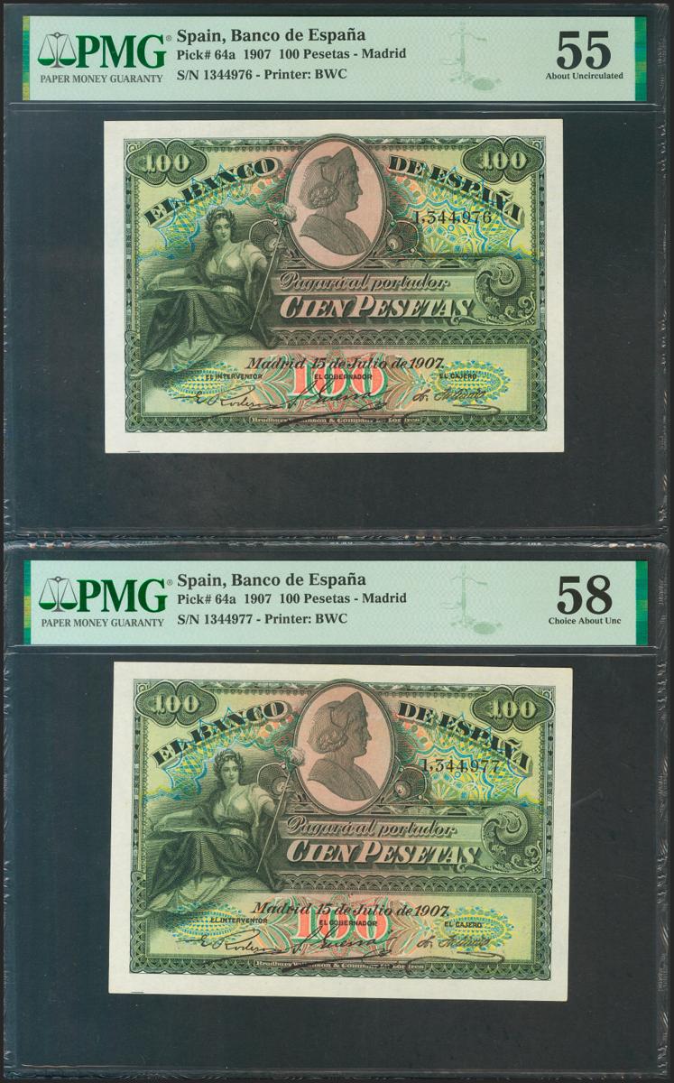100 pesetas. July 15, 1907. Correlative pair. No serie. (Edifil 2021: 320, Pick: 64a). Rare, especially in this quality. EBC ++ / Good Extremely Fine. PMG58 / 55 package.