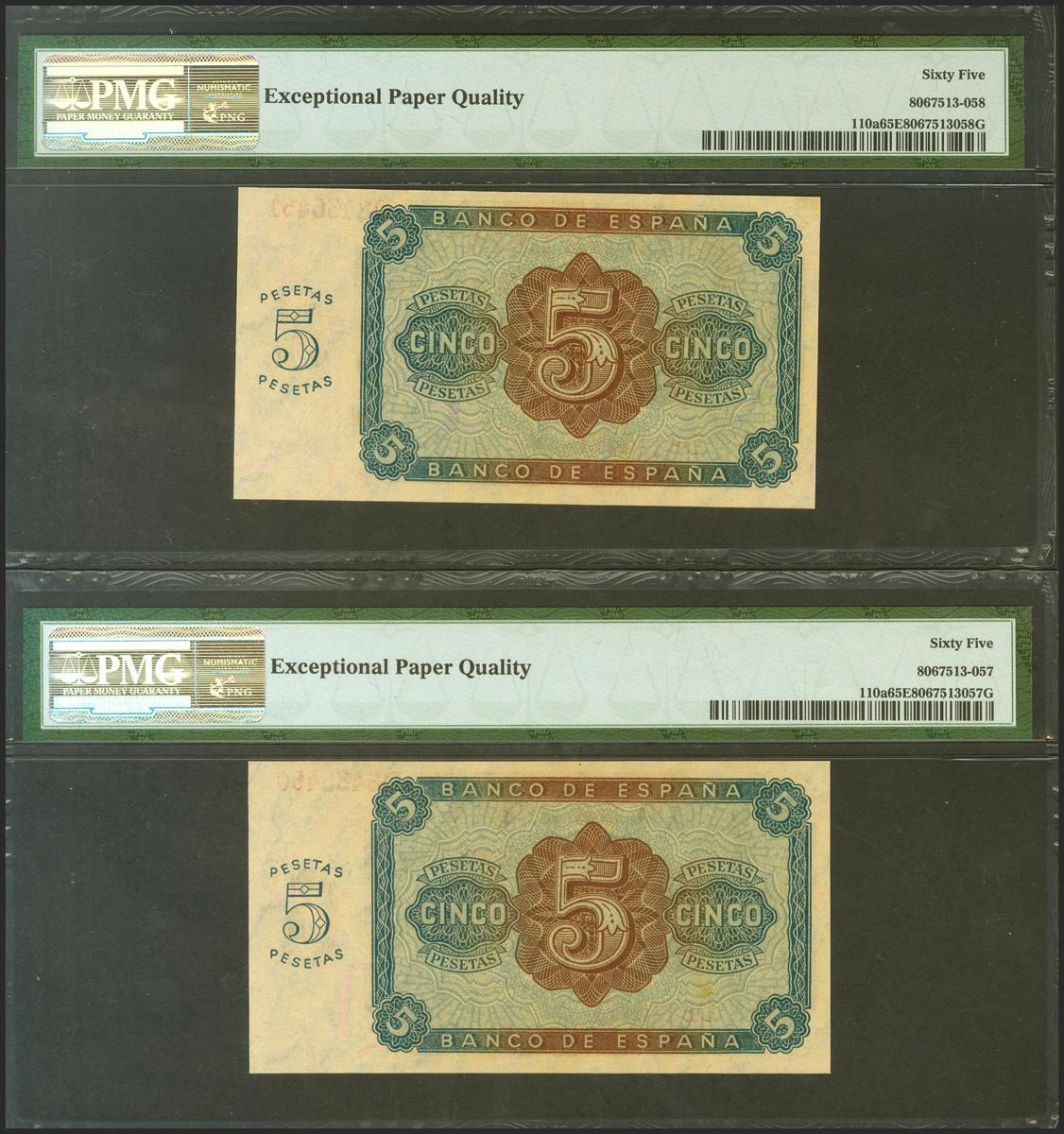 5 Pesetas. August 10, 1938. Correlative couple. Series D. (Edifil 2021: 435a, Pick: 110a). Original sizing. Uncirculated. PMG65EPQ packages, both.