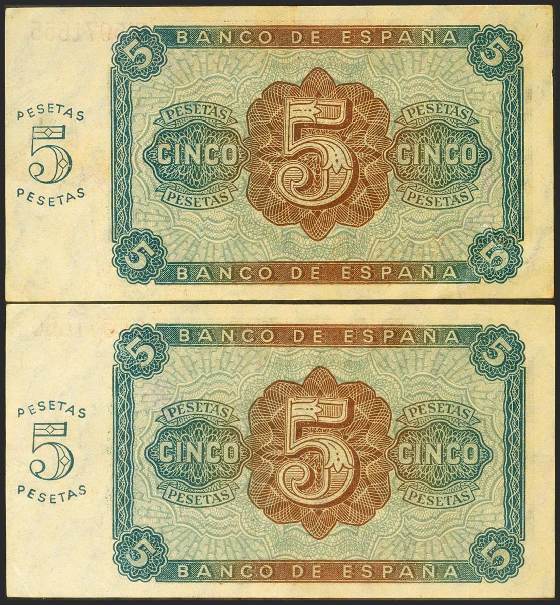 English 5 Pesetas. August 10, 1938. Correlative couple. Series E. (Edifil 2021: 435a). Retains part of the original size. Good Extremely Fine. (one of the banknotes small break)
