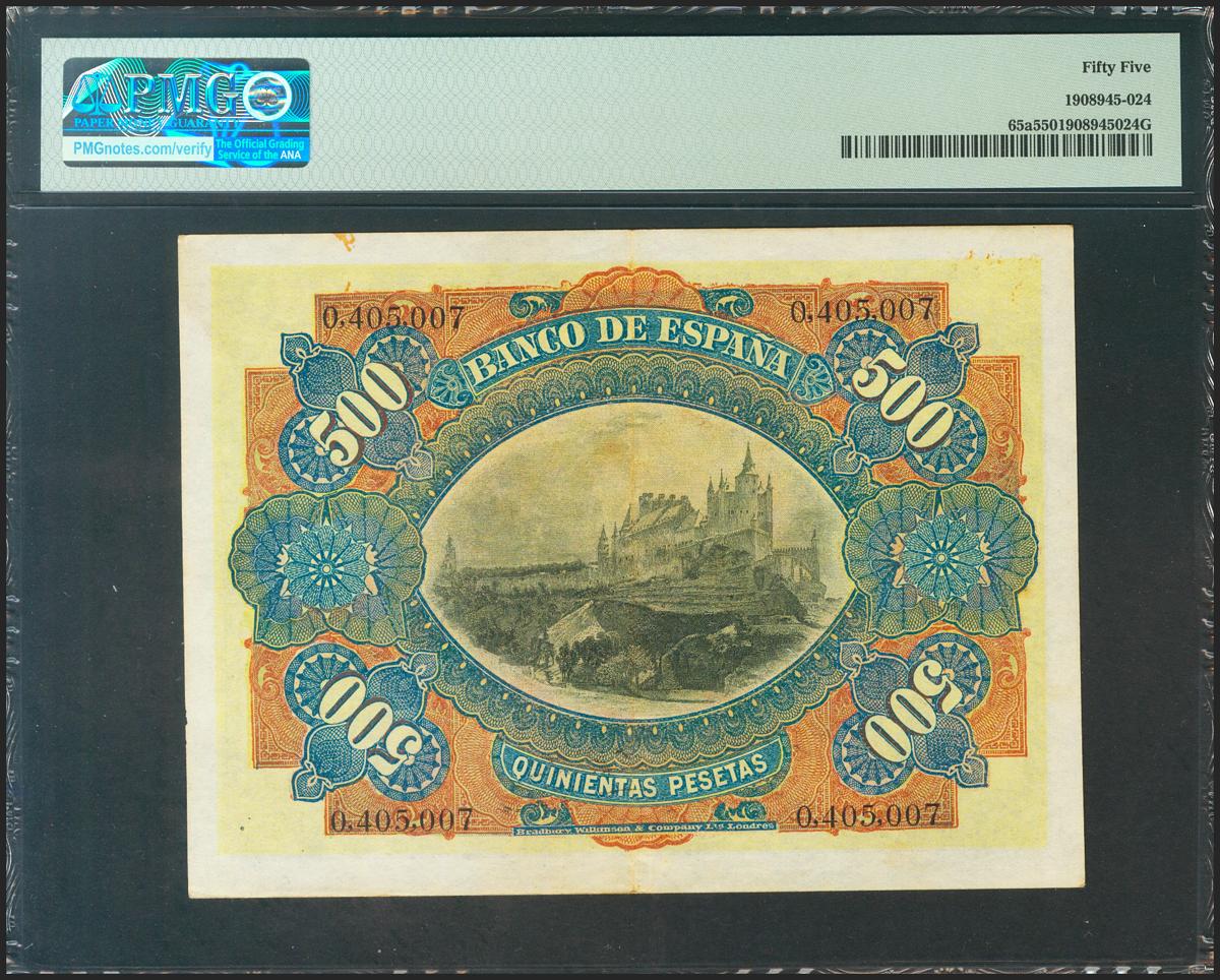 500 pesetas. July 15, 1907. Without series. (Edifil 2021: 321, Pick: 65a). Very rare in this quality. Good Extremely Fine. Packaged PMG55. (To get an idea of the rarity, as of November 4, 2021, this banknote is the sixth best rated along with four other tickets in PMG)