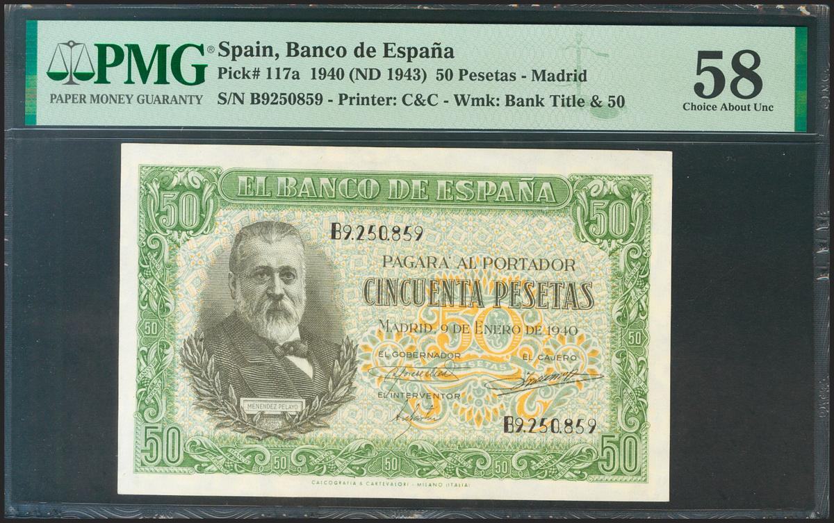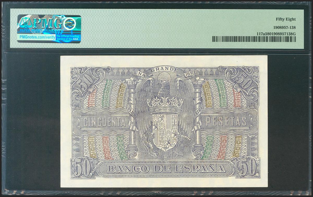 50 Pesetas. January 9, 1940. Series B. (Edifil 2021: 437a, Pick: 117a). EBC ++. PMG58 package.