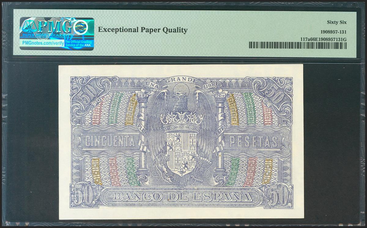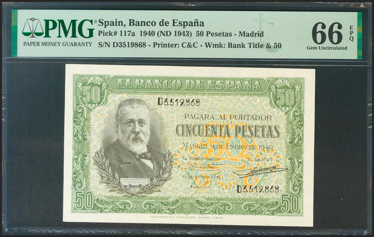 English 50 pesetas. January 9, 1940. Series D. (Edifil 2021: 437a, Pick: 117a). Rare in this quality, original sizing. Uncirculated. Package PMG66EPQ.