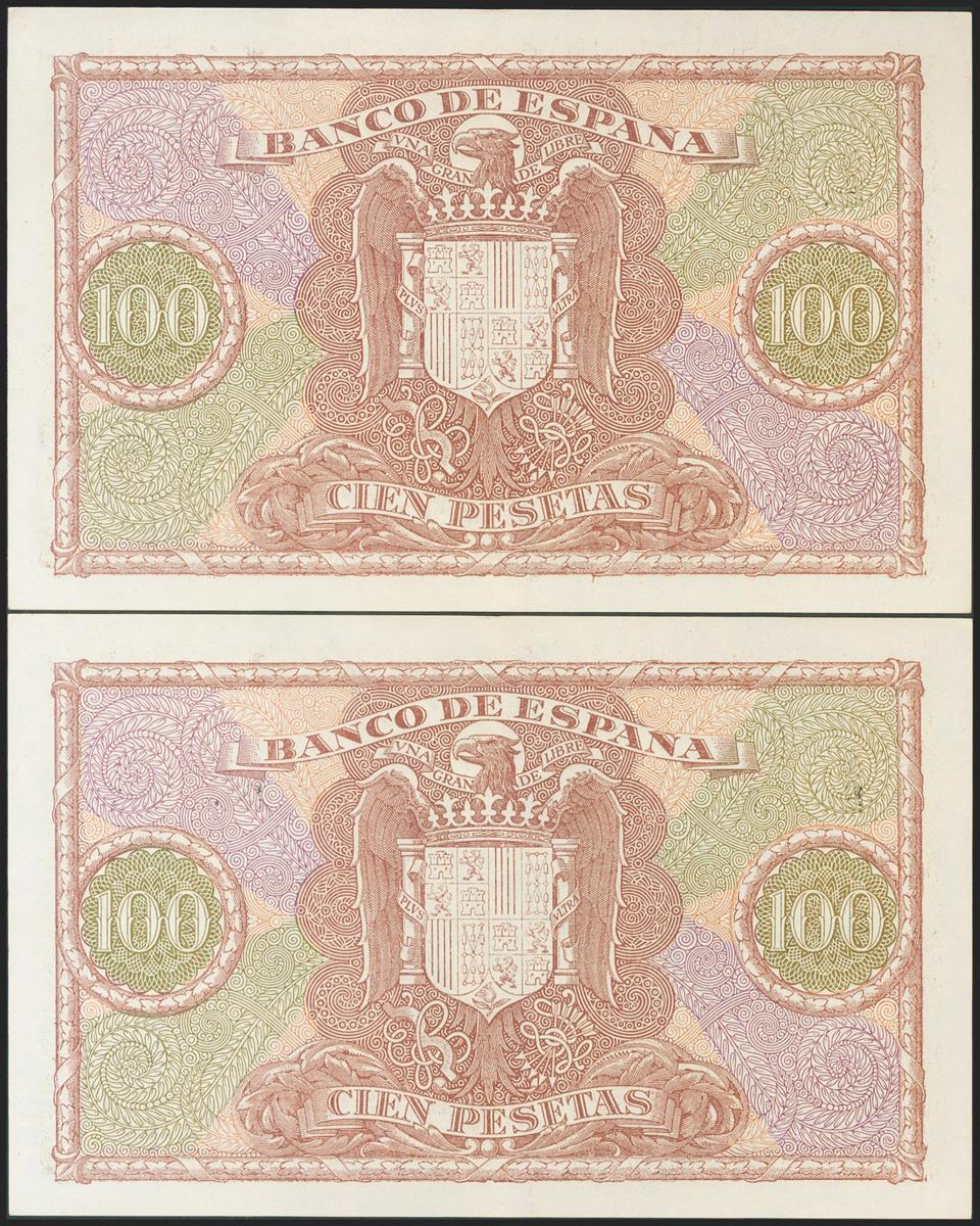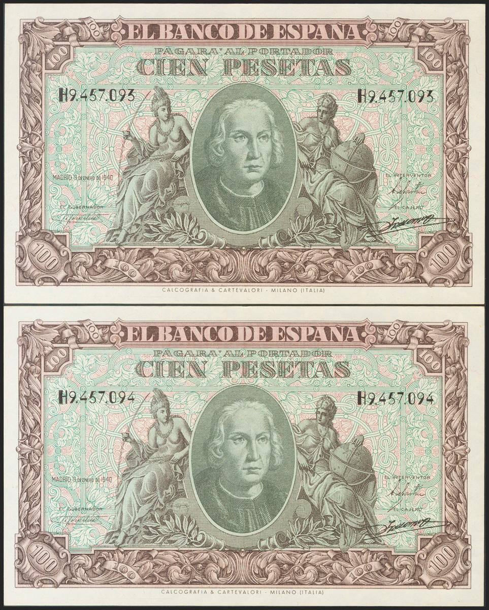 100 pesetas. January 9, 1940. Correlative pair. Series H. (Edifil 2021: 438a). Preserving much of the original size. Good Extremely Fine.
