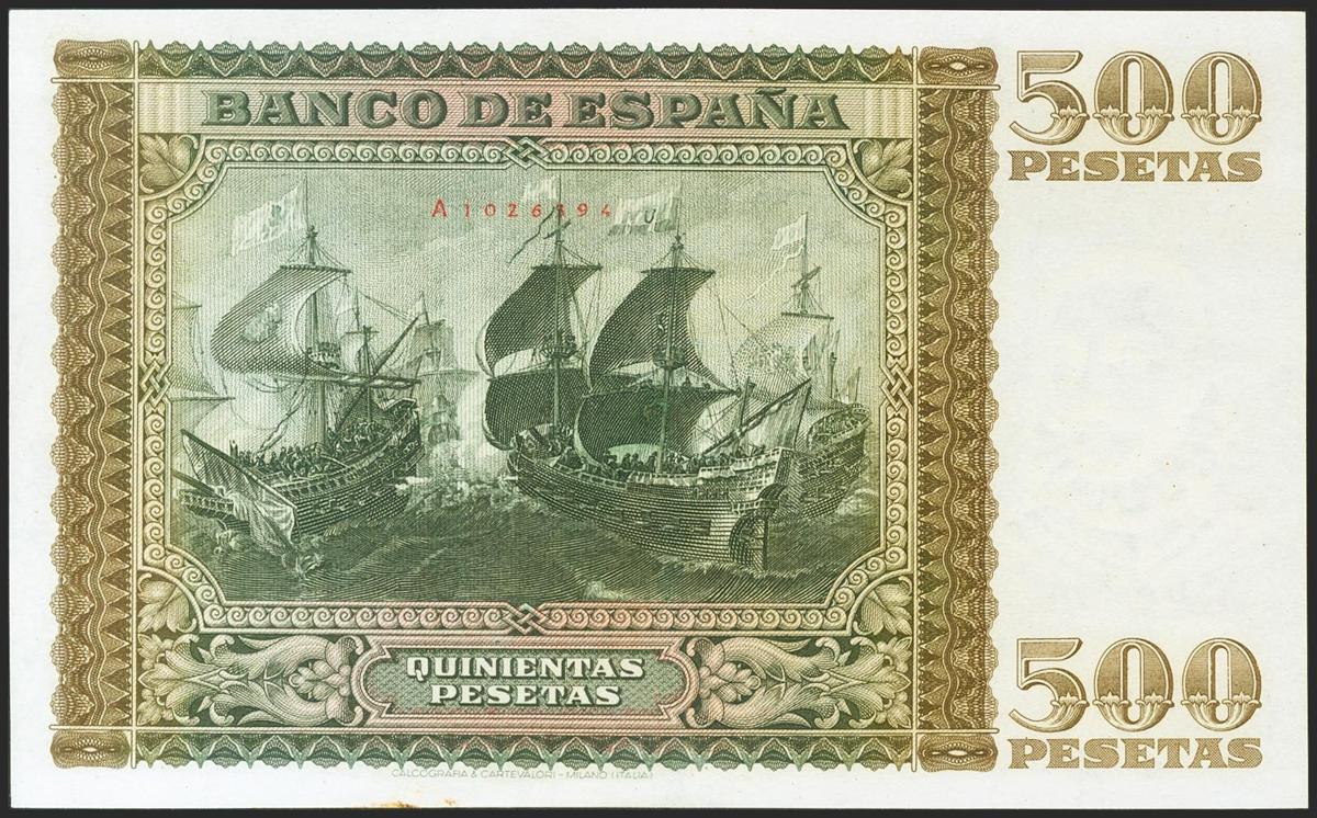 500 pesetas. January 9, 1940. Series A. (Edifil 2021: 439). It retains all its original finish, invisible ripple only perceptible with incident light, rare especially in this exceptional quality. EBC ++. (the bill was taken from its 58-rated PMG capsule)
