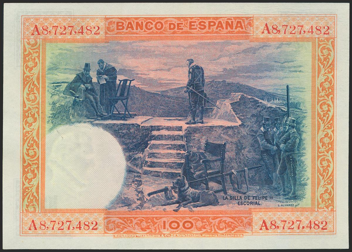 100 pesetas. July 1, 1925. Series A. (Edifil 2021: 323a). It retains much of the original size. Good Extremely Fine.