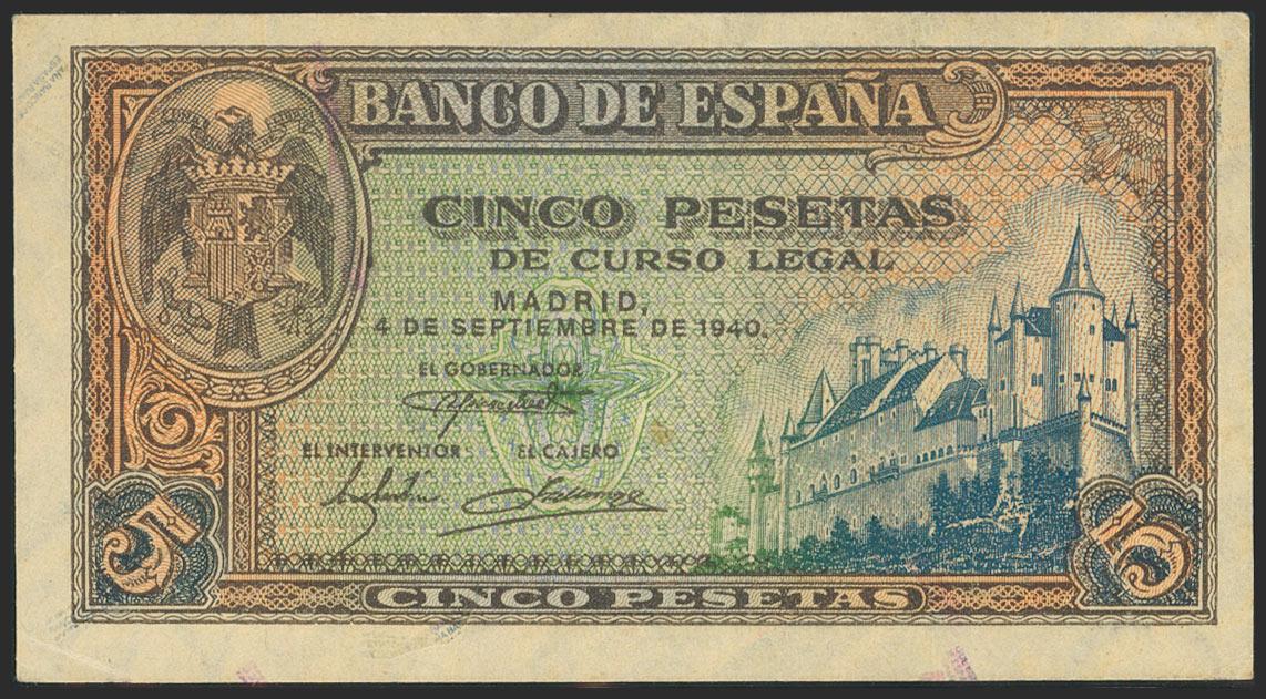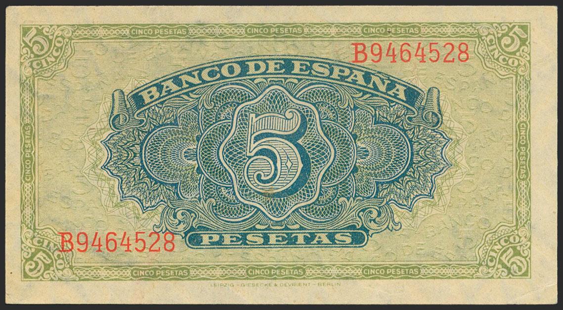 5 Pesetas. September 4, 1940. Series B. (Edifil 2021: 443a). It retains much of the original size. Good Extremely Fine.