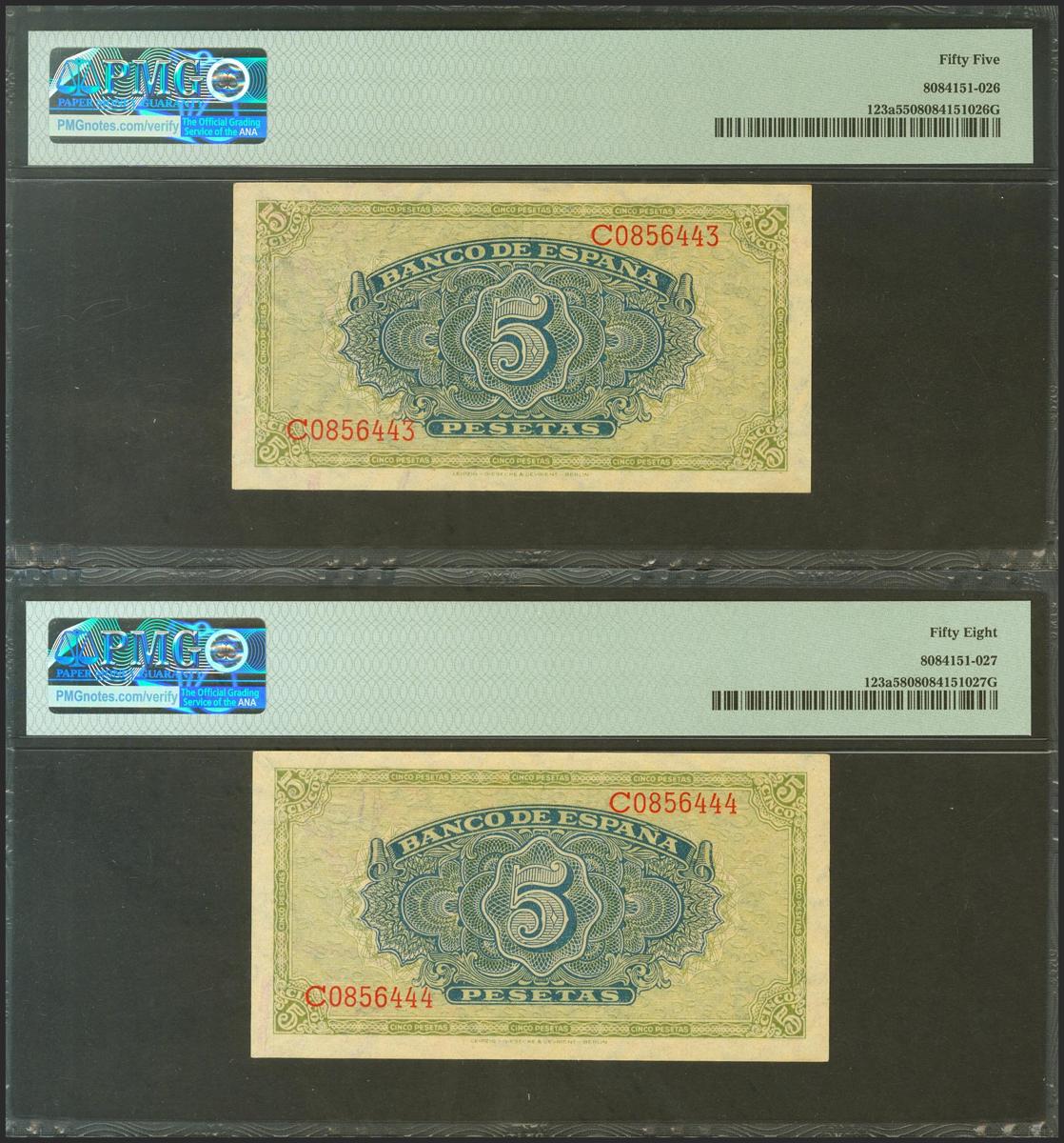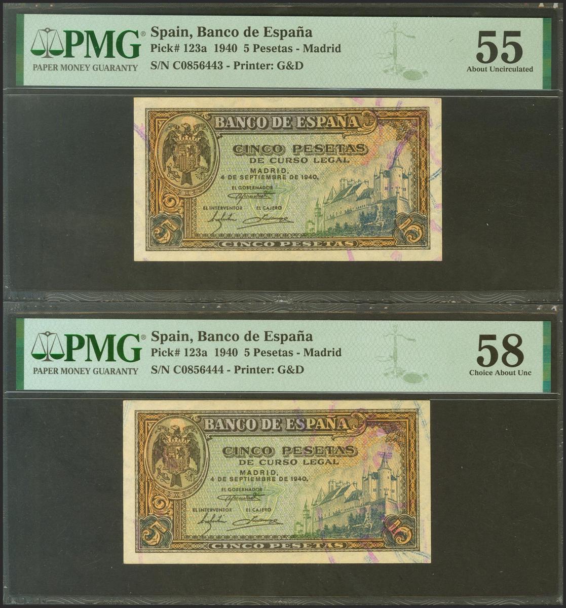 5 Pesetas. September 4, 1940. Correlative pair. Series C. (Edifil 2021: 443a, Pick: 123a). Good Extremely Fine/ EBC ++. Encapsulated PMG55 / 58.