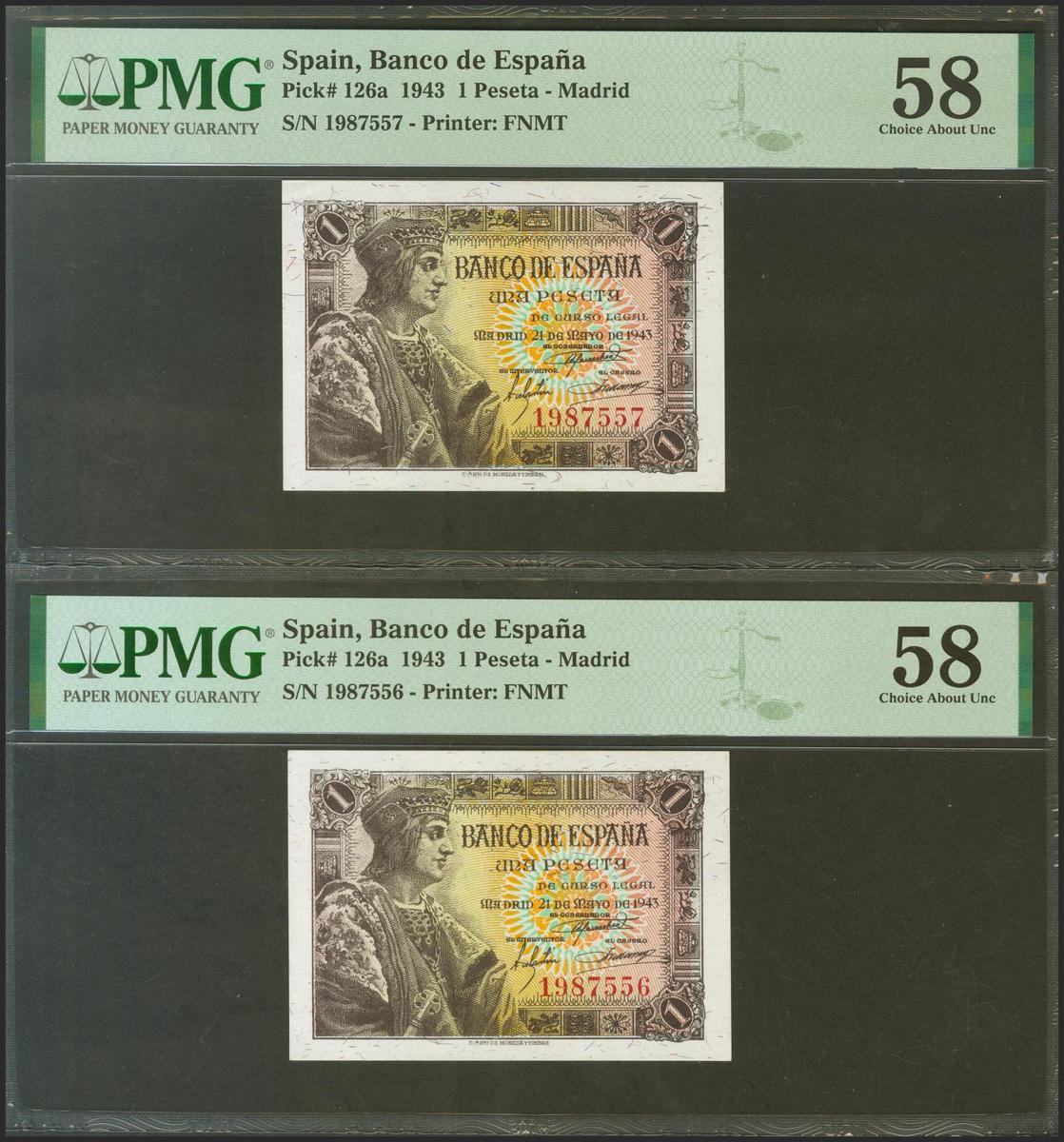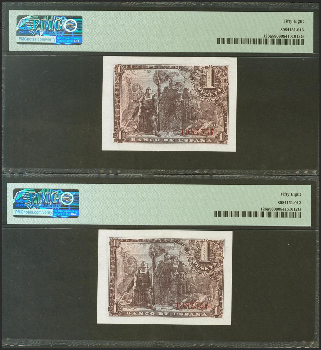 1 peseta. May 21, 1943. Correlative couple. No serie. (Edifil 2021: 447, Pick: 126a). EBC ++. PMG58 packages, both.