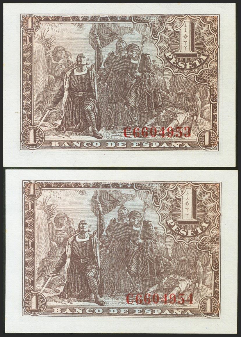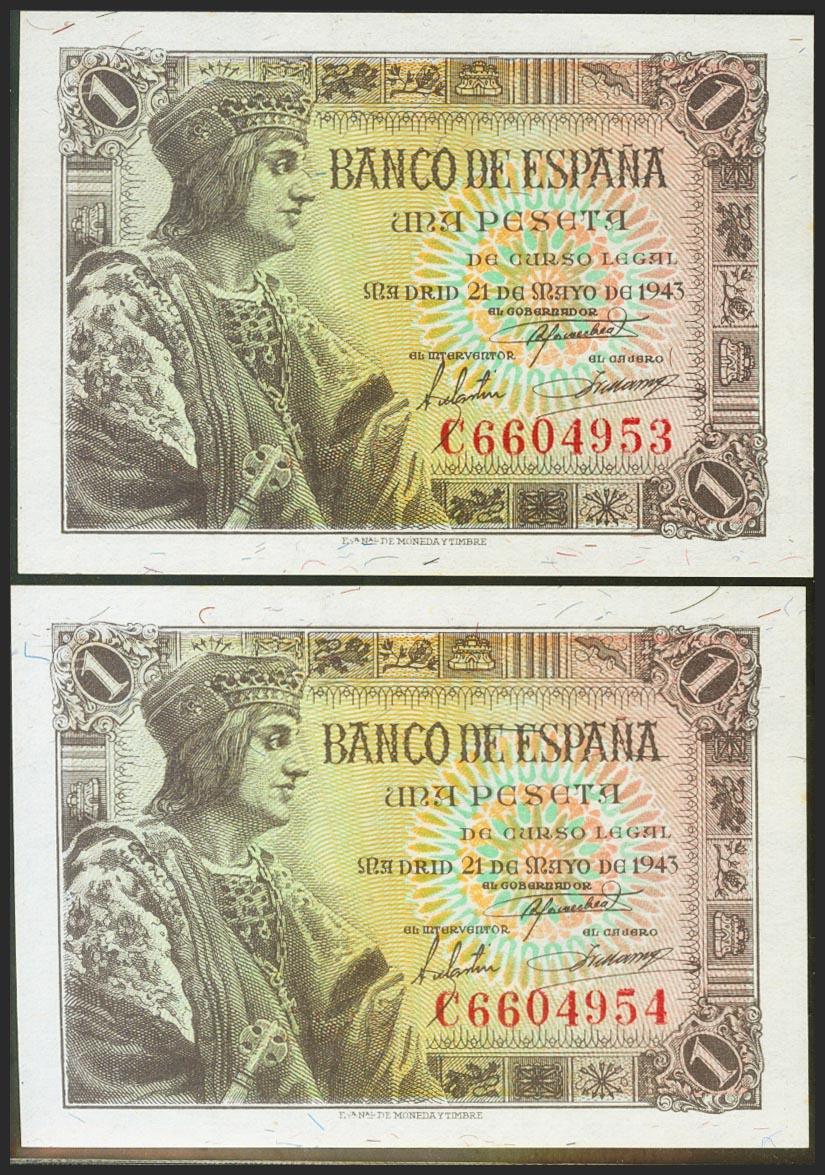 1 peseta. May 21, 1943. Correlative pair. Series C. (Edifil 2021: 447a). Original sizing. Uncirculated.