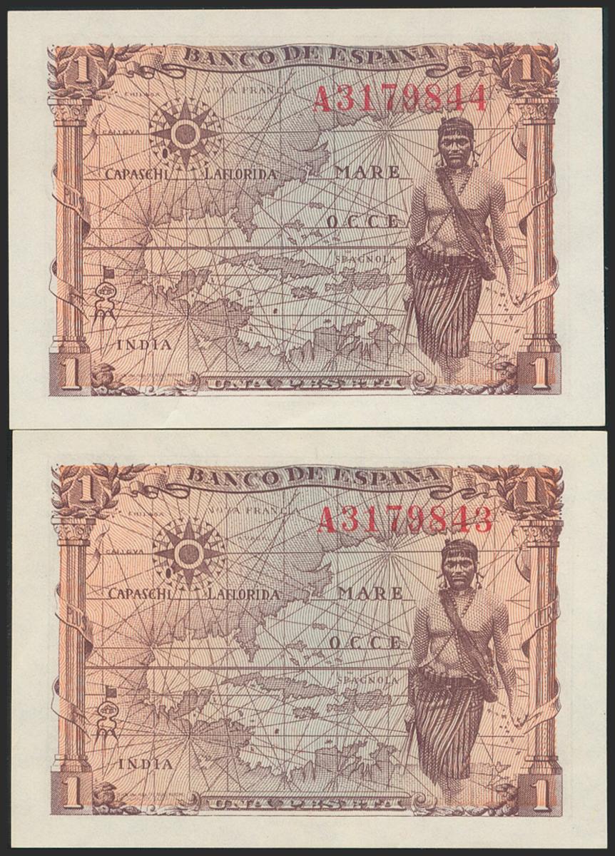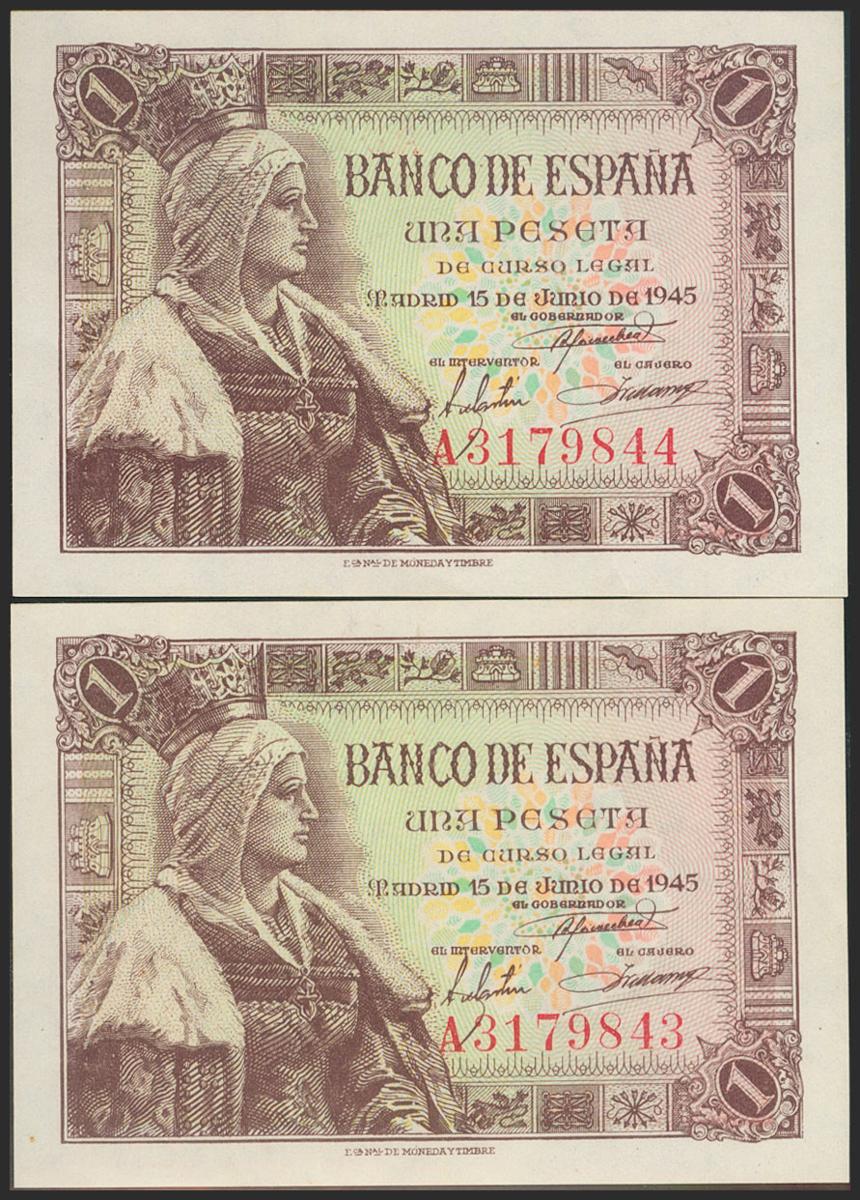 1 peseta. June 15, 1945. Correlative couple. Series A. (Edifil 2021: 448a). Original sizing. Almost Uncirculated.