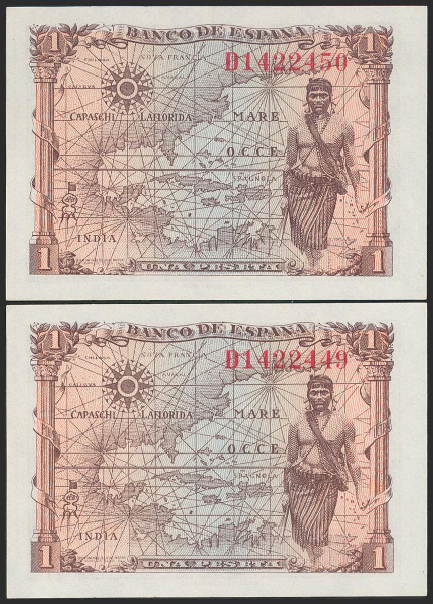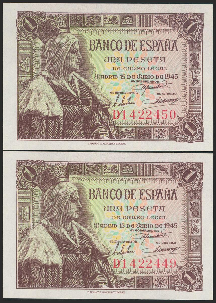 English 1 peseta. June 15, 1945. Correlative couple. Series D. (Edifil 2021: 448a). Original sizing. Uncirculated.
