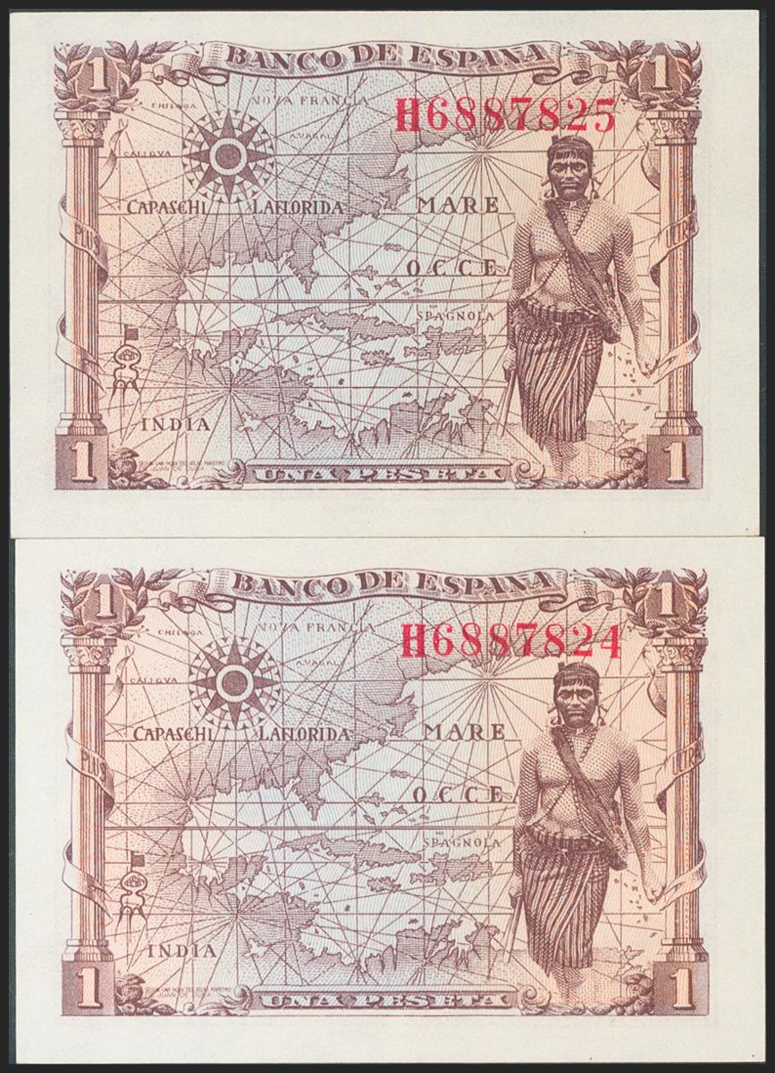 1 peseta. June 15, 1945. Correlative pair. Series H. (Edifil 2021: 448a). Original sizing. Uncirculated.