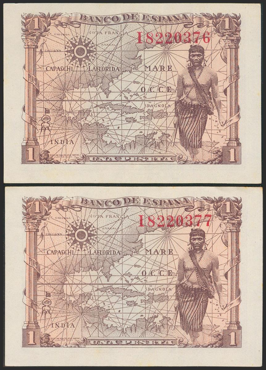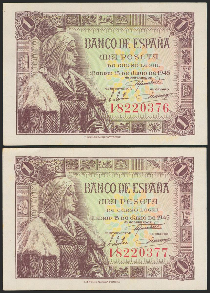 English 1 peseta. June 15, 1945. Correlative pair. Series I. (Edifil 2021: 448a). Original sizing. Good Extremely Fine.