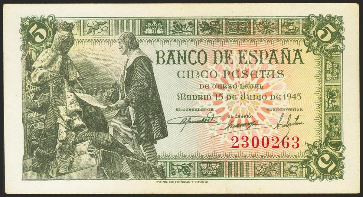 5 Pesetas. June 15, 1945. Without series. (Edifil 2021: 449). Uncirculated.
