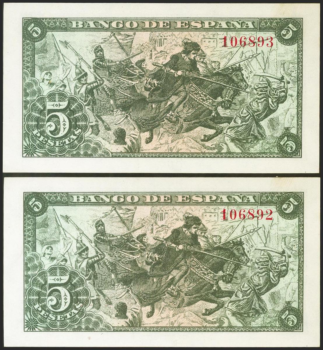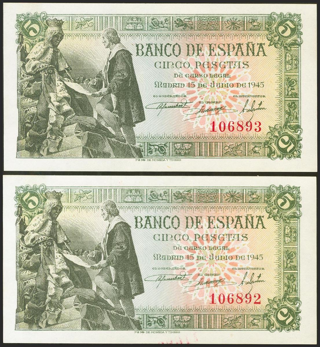 5 Pesetas. June 15, 1945. Correlative couple. No serie. (Edifil 2021: 449). Original sizing. Uncirculated.