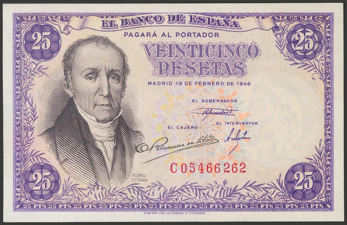 25 pesetas. February 19, 1946. Series C. (Edifil 2017: 450a). Original sizing. Almost Uncirculated.