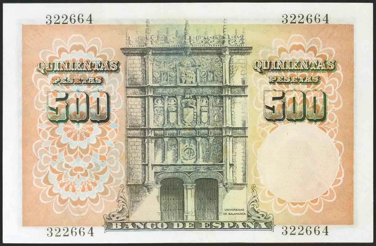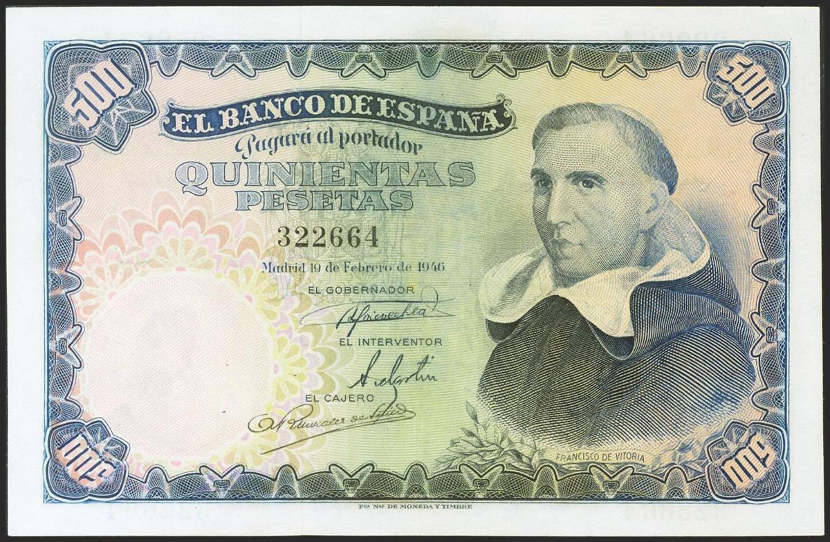 500 pesetas. February 19, 1946. Without series. (Edifil 2021: 452). Rare, especially preserving all its original size, invisible ripple only perceptible with incident light. Good Extremely Fine. (the bill was taken from its 55-rated PMG capsule)