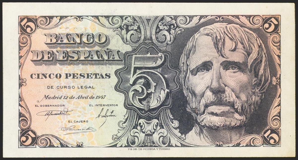 5 Pesetas. April 12, 1947. Without series. (Edifil 2021: 454). Original sizing. Good Extremely Fine.