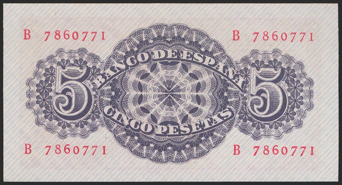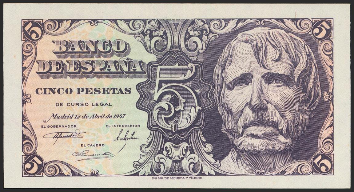 English 5 Pesetas. April 12, 1947. Series B. (Edifil 2021: 454a). Original sizing. Almost Uncirculated.