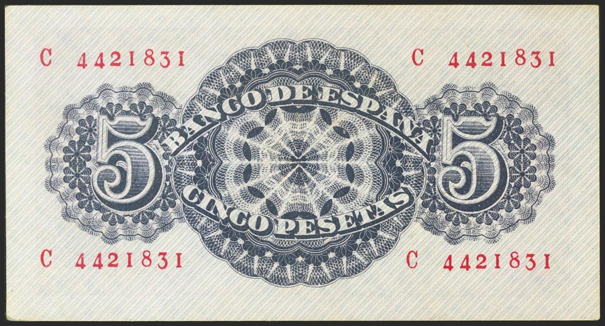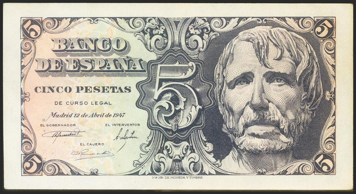 English 5 Pesetas. April 12, 1947. Series C. (Edifil 2021: 454a). Stains of time and original sizing. Almost Uncirculated.