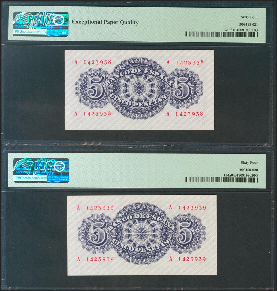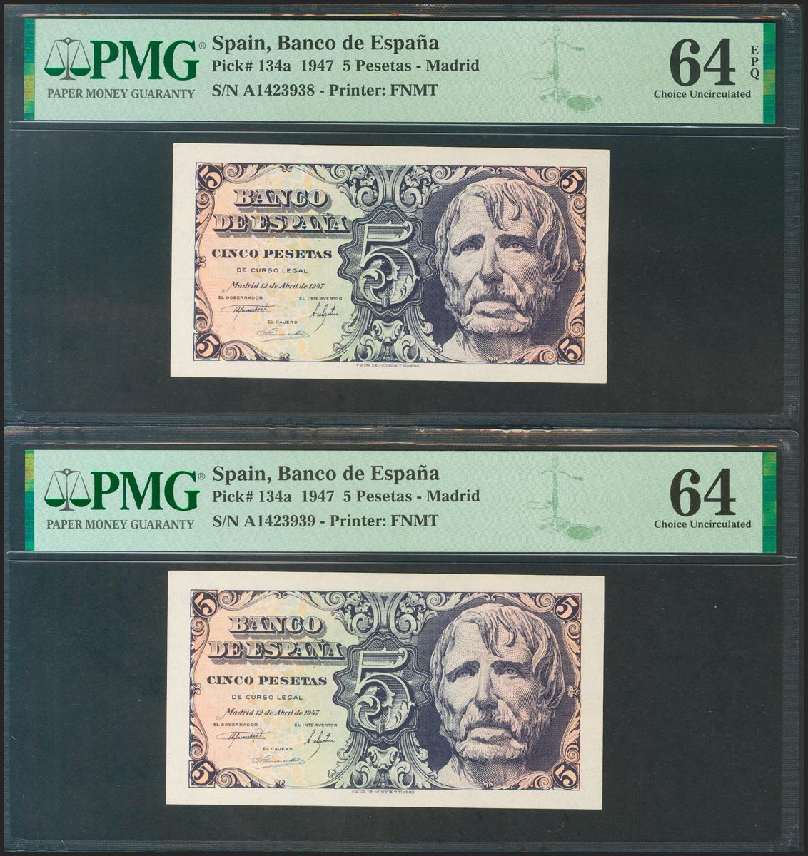 5 Pesetas. April 12, 1947. Correlative pair. Series A. (Edifil 2021: 454a, Pick: 134a). Unusual in this quality. Uncirculated. PMG64 package, both.