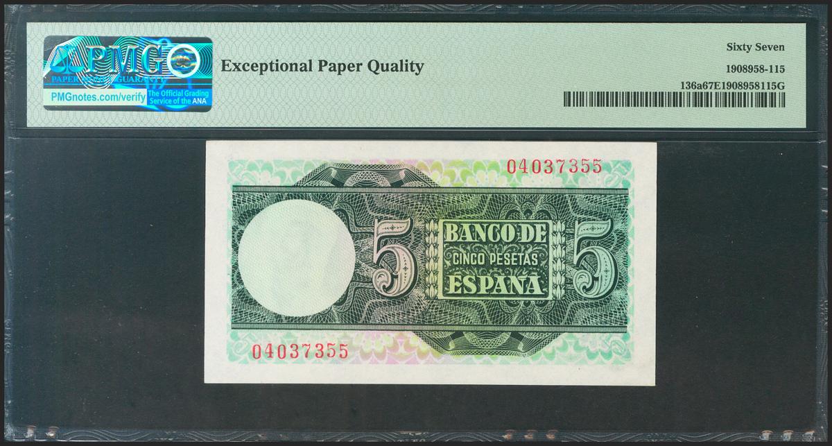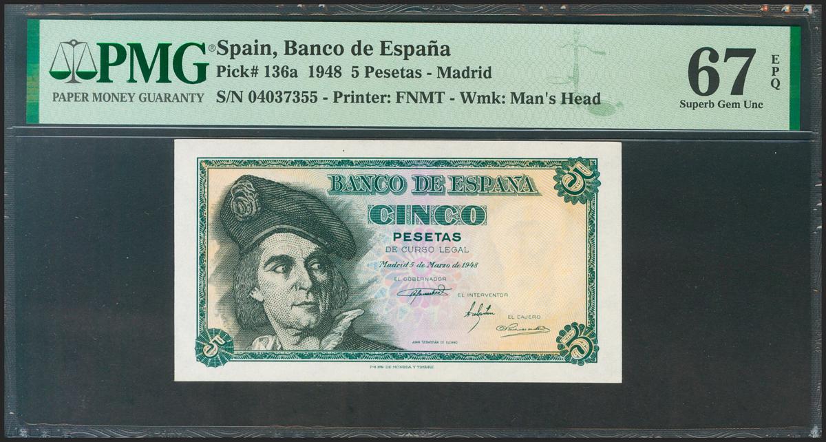 5 Pesetas. March 15, 1948. Without series. (Edifil 2021: 455, Pick: 136a). Very rare in this quality, original sizing. Uncirculated. Package PMG67EPQ.