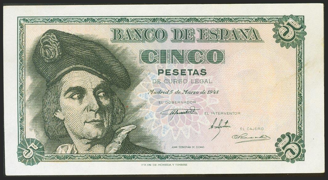 English 5 Pesetas. March 5, 1948. Series C. (Edifil 2021: 455a). Original sizing. Almost Uncirculated.