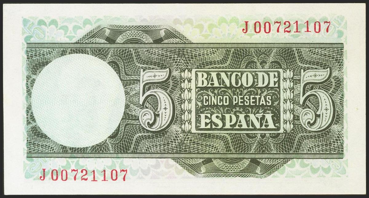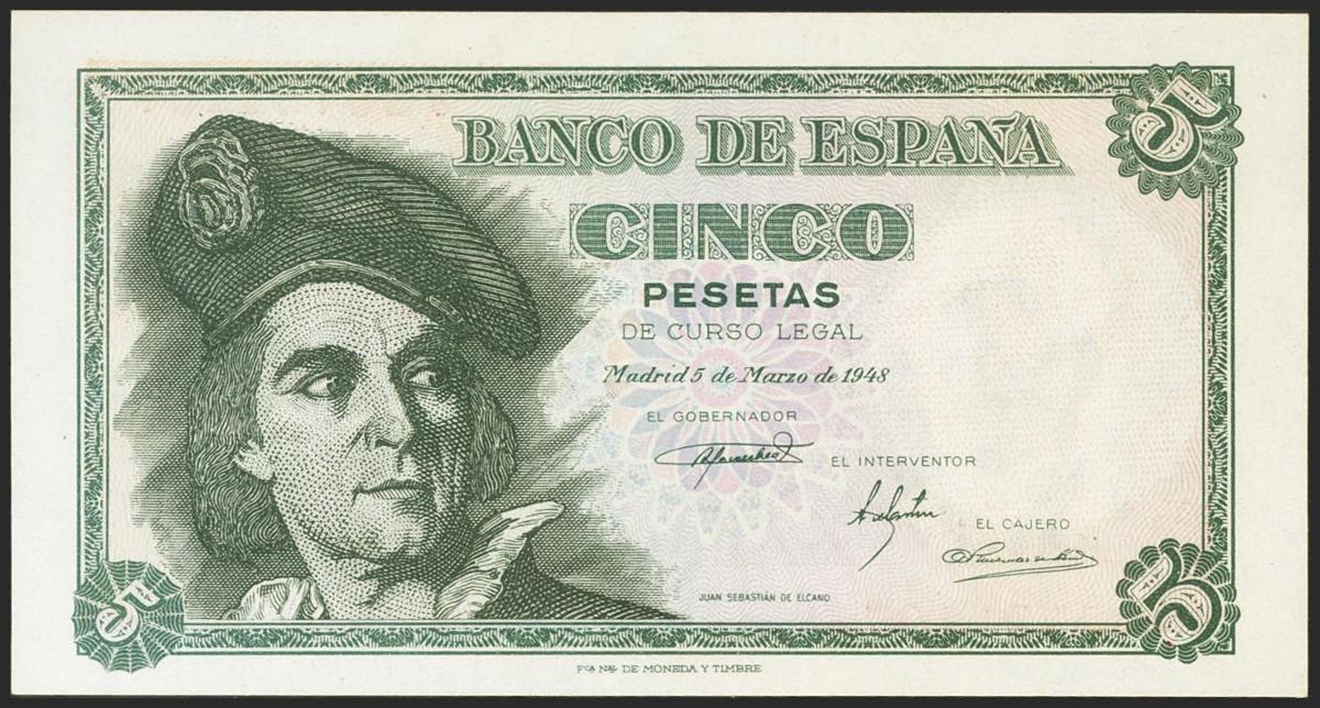 5 Pesetas. March 5, 1948. Series J. (Edifil 2021: 455a). Original sizing. Uncirculated.