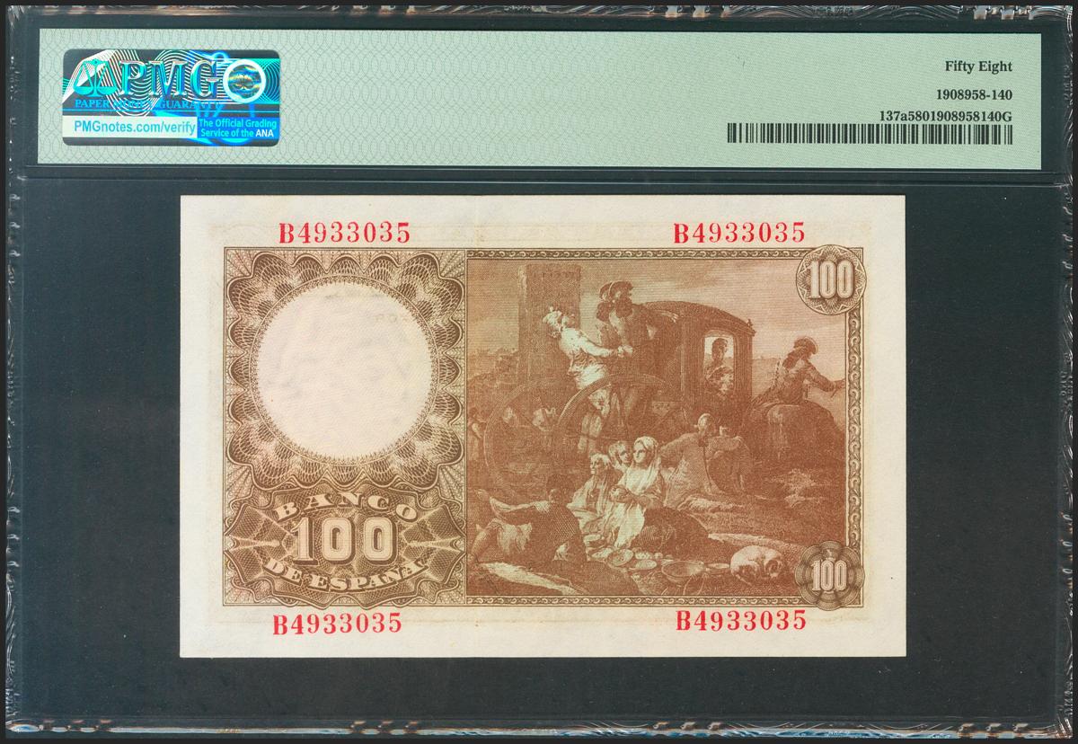 100 pesetas. May 2, 1948. Series B. (Edifil 2021: 456a, Pick: 137a). Unusual in this quality. EBC ++. PMG58 package.