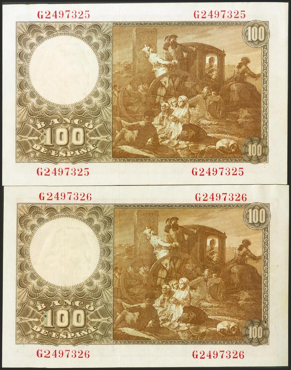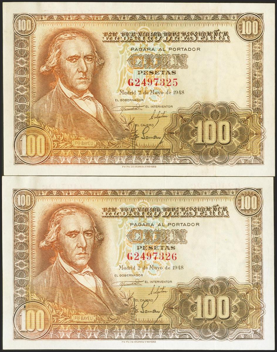 100 pesetas. May 2, 1948. Correlative pair. Series G. (Edifil 2021: 456a). It keeps all the original sizing. Extremely Fine. (one of the needlepoint bills)