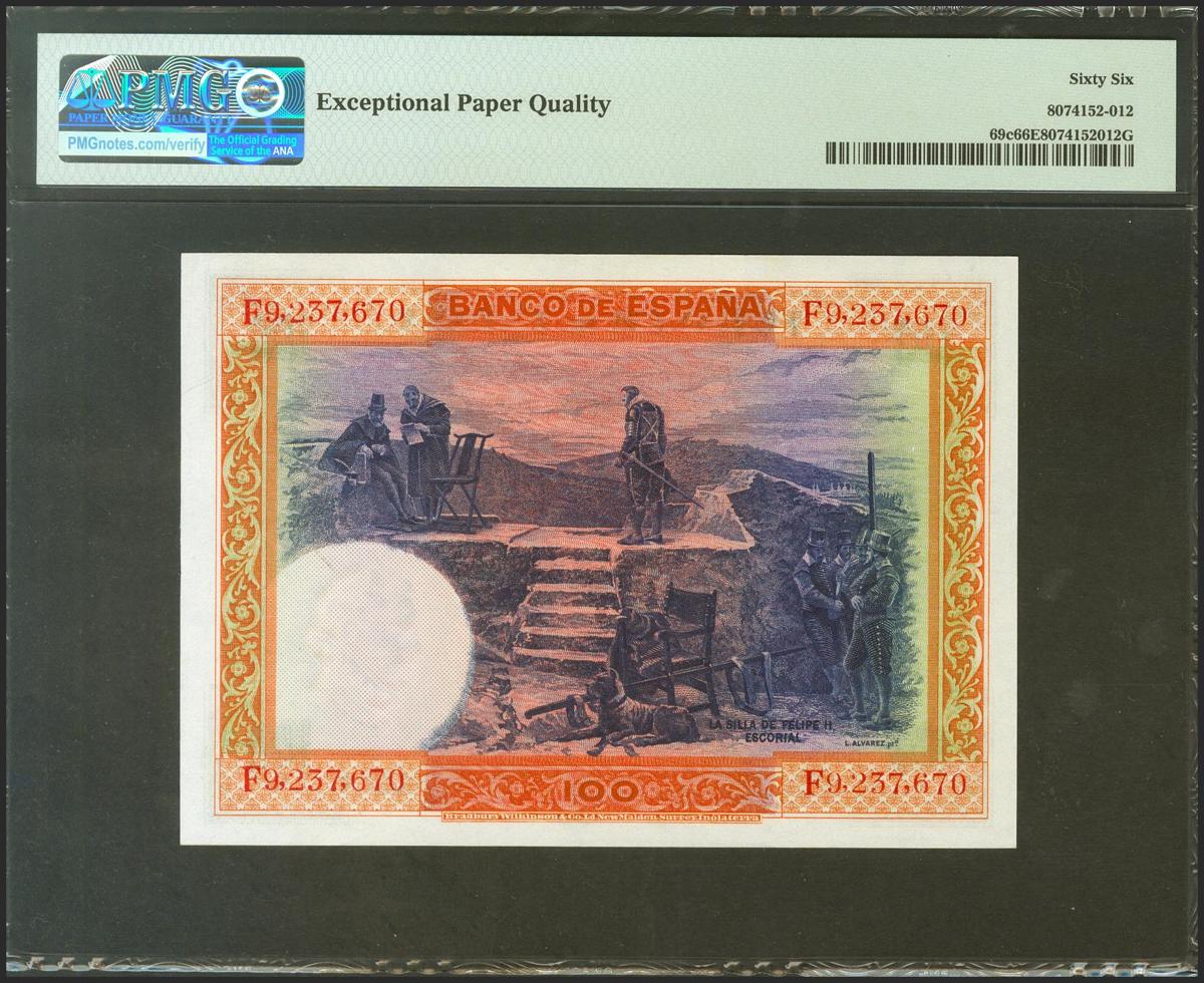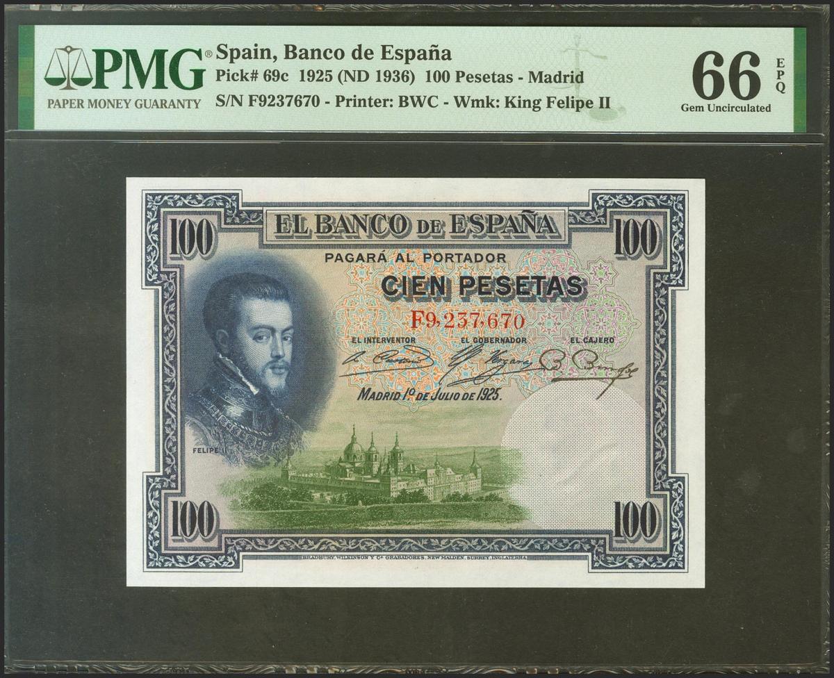 English 100 pesetas. July 1, 1925. Series F, last series issued. (Edifil 2021: 350, Pick: 64c). Original sizing. Uncirculated. Package PMG66EPQ.