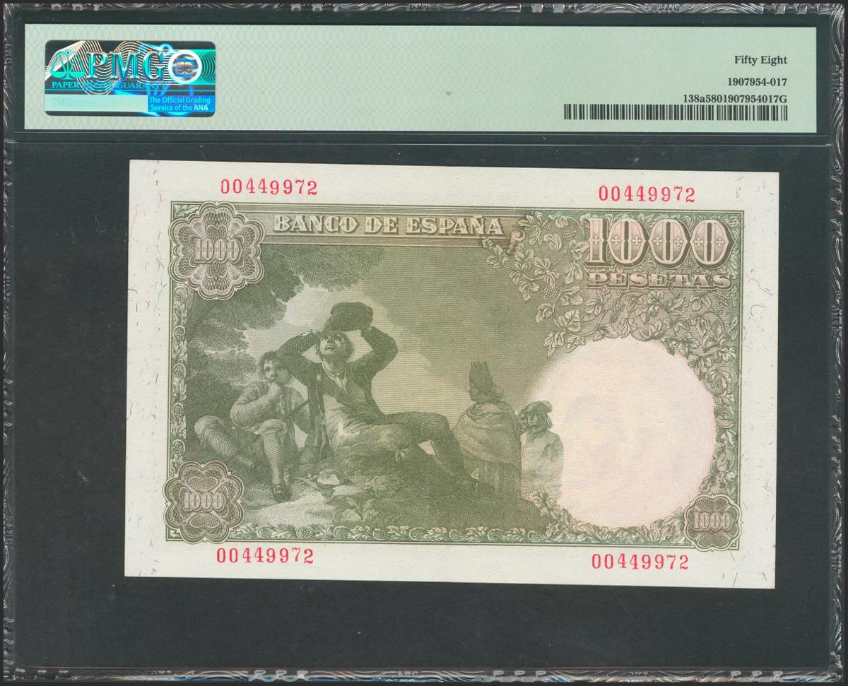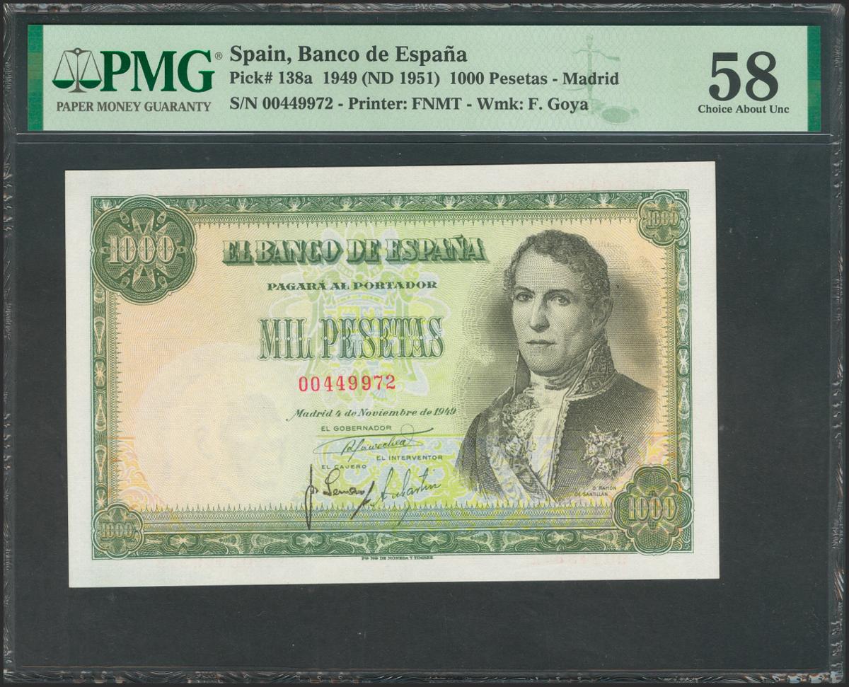 1000 Pesetas. November 4, 1949. Without series. (Edifil 2017: 458). Rare in this quality. Good Extremely Fine. PMG58 package.