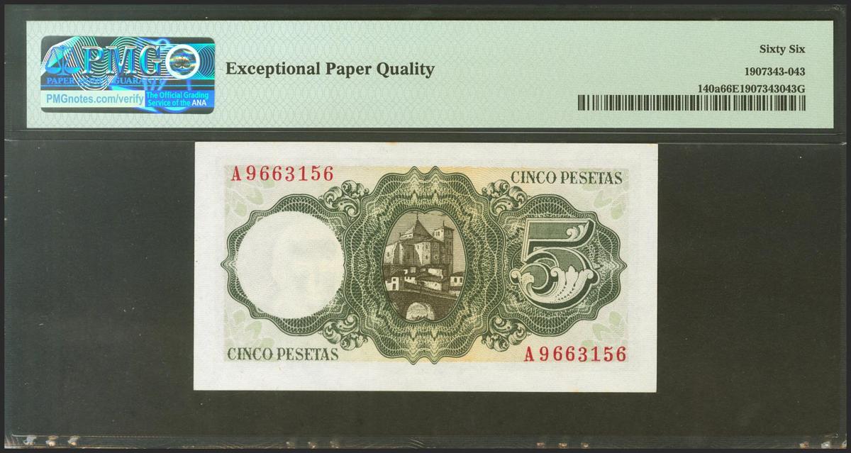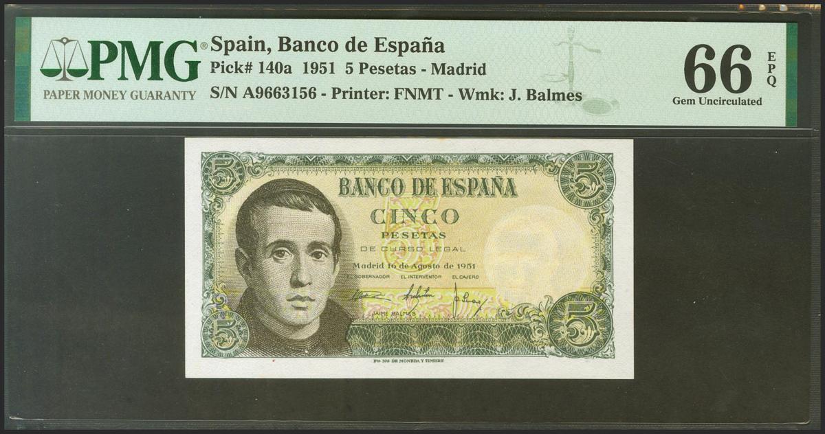 English 5 Pesetas. August 16, 1951. Series A. (Edifil 2021: 459a, Pick: 140a). Original sizing. Uncirculated. Package PMG66EPQ.